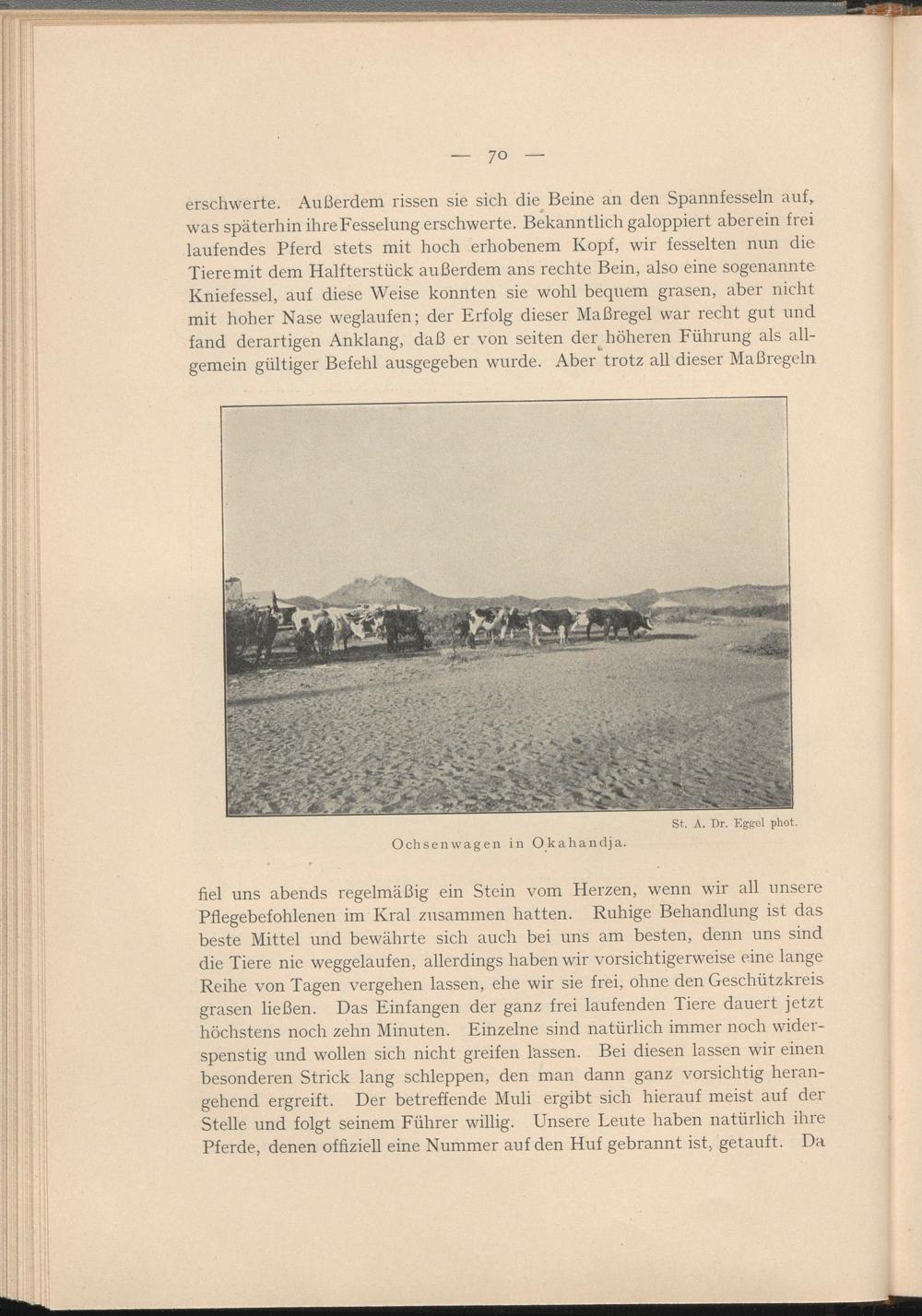 fiel uns abends regelmäßig ein Stein vom Herzen, wenn wir all unsere Pflegebefohlenen im Kral zusammen hatten. Ruhige Behandlung ist das beste Mittel und bewährte sich auch bei uns am besten, denn uns sind die Tiere nie weggelaufen, allerdings haben wir vorsichtigerweise eine lange Reihe von Tagen vergehen lassen, ehe wir sie frei, ohne den Geschützkreis grasen ließen. Das Einfangen der ganz frei laufenden Tiere dauert jetzt höchstens noch zehn Minuten. Einzelne sind natürlich immer noch widerspenstig und wollen sich nicht greifen lassen. Bei diesen lassen wir einen besonderen Strick lang schleppen, den man dann ganz vorsichtig herangehend ergreift. Der betreffende Muli ergibt sich hierauf meist auf der Stelle und folgt seinem Führer willig. Unsere Leute haben natürlich ihre Pferde, denen offiziell eine Nummer auf den Huf gebrannt ist, getauft. Da