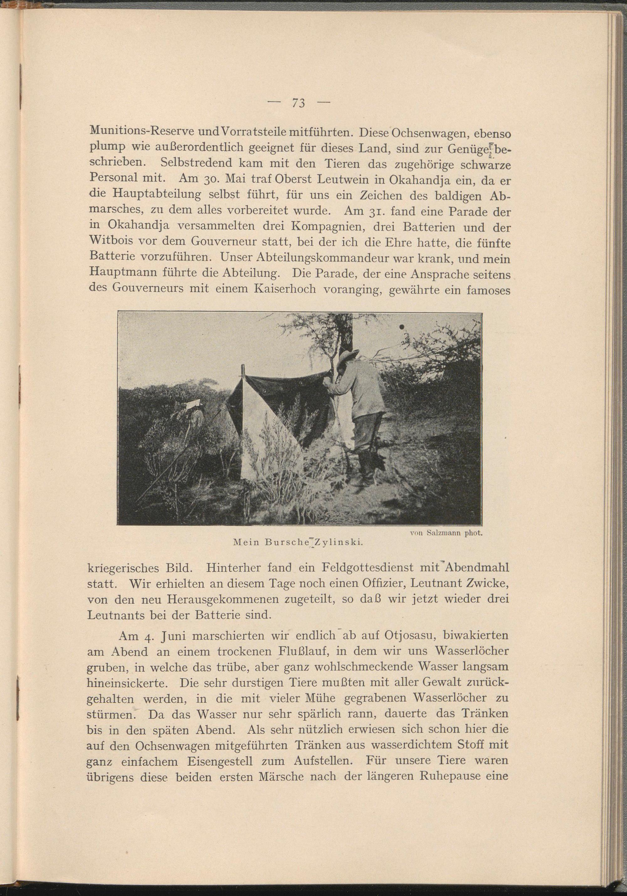 Munitions-Reserve und Vorrats teile mitführten. Diese Ochsenwagen, ebenso plump wie außerordentlich geeignet für dieses Land, sind zur Genügefbe- schrieben. Selbstredend kam mit den Tieren das zugehörige schwarze Personal mit. Am 30. Mai traf Oberst Leutwein in Okahandja ein, da er die Hauptabteilung selbst führt, für uns ein Zeichen des baldigen Abmarsches, zu dem alles vorbereitet wurde. Am 31. fand eine Parade der in Okahandja versammelten drei Kompagnien, drei Batterien und der Witbois vor dem Gouverneur statt, bei der ich die Ehre hatte, die fünfte Batterie vorzuführen. Unser Abteilungskommandeur war krank, und mein Hauptmann führte die Abteilung. Die Parade, der eine Ansprache seitens des Gouverneurs mit einem Kaiserhoch voranging, gewährte ein famoses