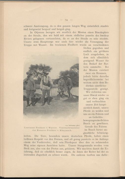Wir richteten uns unser Biwak wieder so gut es eben ging ein und verbrachten unsere Zeit hauptsächlich damit, unsere Pferde zu weiden und uns an ein Fahren und an Gefechtsbewegungen im dichten Busch zu gewöhnen. Gerade das Fahren im Busch bietet unglaubliche Schwierigkeiten. Die Tiere, besonders unsere deutschen Pferde, haben einen heillosen Respekt vor den Dornen, und oft genug passierte es im Anfänge einem der Vorderreiter, daß sein Pferdepaar über den zu nehmenden Weg seine eigenen Ansichten hatte. Unsere Stangenmulis werden vom Bock aus, also von der Protze aus, gefahren. Wir machten damit die Erfahrung, daß sie erheblich besser zogen, da ihnen der Reiter bei der zu leistenden Zugarbeit zu schwer wurde. Die anderen tauften uns dafür: