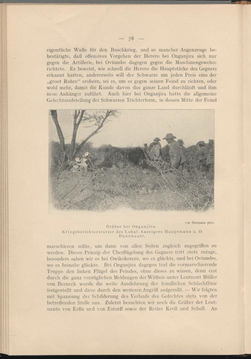 marschieren sollte, um dann von allen Seiten zugleich angegriffen zu werden. Dieses Prinzip der Überflügelung des Gegners tritt stets zutage, besonders sahen wir es bei Owikokorero, wo es glückte, und bei Oviumbo, wo es beinahe glückte. Bei Onganjira dagegen traf die vormarschierende Truppe den linken Flügel des Feindes, ohne dieses zu wissen, denn erst durch die ganz vorzüglichen Meldungen derWitbois unter Leutnant Müller von Berneck wurde die weite Ausdehnung der feindlichen Schlachtlinie festgestellt und diese durch den weiteren Angriff aufgerollt. —Wir folgten mit Spannung der Schilderung des Verlaufs des Gefechtes stets von der betreffenden Stelle aus. Zuletzt besuchten wir noch die Gräber der Leutnants von Erffa urd von Estorff sowie der Reiter Kroll und Scholl. An
