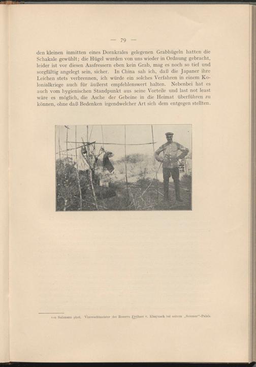 den kleinen inmitten eines Dornkrales gelegenen Grabhügeln hatten die Schakale gewühlt; die Hügel wurden von uns wieder in Ordnung gebracht, leider ist vor diesen Aasfressern eben kein Grab, mag es noch so tief und sorgfältig angelegt sein, sicher. In China sah ich, daß die Japaner ihre Leichen stets verbrennen, ich würde ein solches Verfahren in einem Kolonialkriege auch für äußerst empfehlenswert halten. Nebenbei hat es auch vom hygienischen Standpunkt aus seine Vorteile und last not least wäre es möglich, die Asche der Gebeine in die Heimat überführen zu können, ohne daß Bedenken irgendwelcher Art sich dem entgegen stellten.