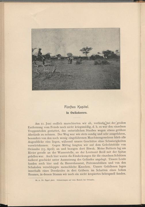 Am ii. Juni endlich marschierten wir ab, vorläufig^bei der^ großen Entfernung vom Feinde noch nicht kriegsmäßig, d. h. es war den einzelnen Truppenteilen gestattet, des entsetzlichen Staubes wegen etwas größere Abstände zu nehmen. Der Weg war wie stets sandig und sehr ausgefahren, besonders von den noch wenig eingefahrenen Maschinengewehren blieb alle Augenblicke eins liegen, während unsere Geschütze ohne Schwierigkeiten vorwärtskamen. Gegen Mittag langten wir auf dem Gefechtsfelde von Oviumbo (13. April) an und bezogen dort Biwak. Meine Batterie lag am Rivier gerade an der Wasserstelle, an der Leutnant Reiß mit der Spitze gefallen war. Auch hier waren die Eindeckungen für die einzelnen Schützen äußerst geschickt unter Ausnutzung des Geländes angelegt. Unsere Leute fanden noch hier und da Hererohausrat, Patronenhülsen und von den Schakalen verschleppte menschliche Knochen. Unsere Gefallenen lagen innerhalb eines Dornkrales in drei Gräbern im Schatten eines hohen Baumes, in dessen Stamm wir noch ein nicht krepiertes Schrapnell fanden.