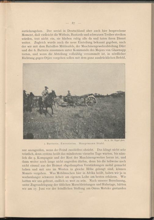zurückzugehen. Der soviel in Deutschland aber auch hier besprochene Moment, daß vielleicht die Witbois, Bastards und schwarzen Treiber streiken würden, trat nicht ein, sie blieben ruhig alle da und taten ihren Dienst weiter. Zugleich wurde auch die neue Einteilung bekannt gegeben, nach der wir mit dem Bataillon Mühlenfels, der Maschinengewehrabteilung Dürr und der 6. Batterie zusammen unter Kommando des Majors von Glasenapp treten, und w r enn die Abteilung vollzählig versammelt ist, in nördlicher Richtung gegen Otjire vorgehen sollen mit dem ganz ausdrücklichen Befehl,
