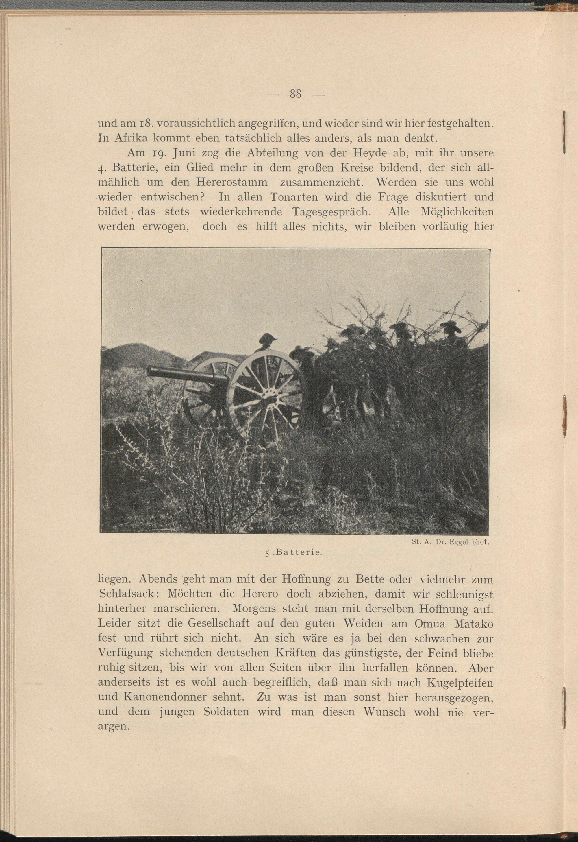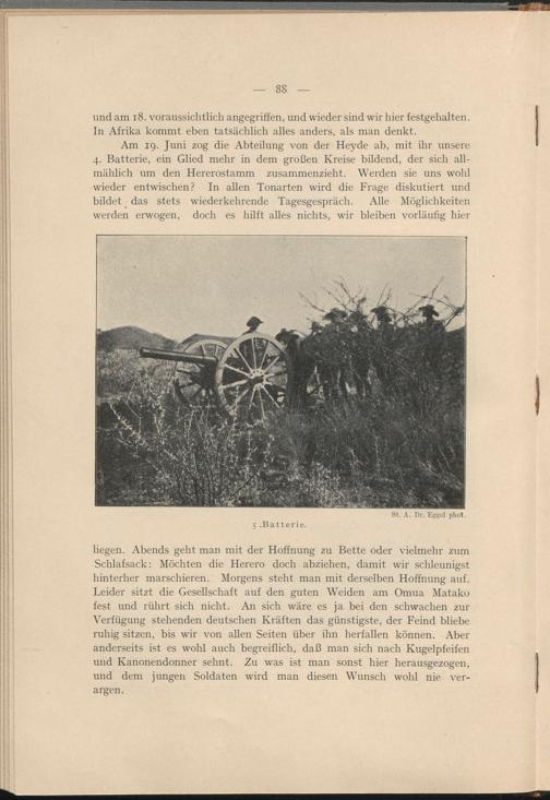 Am 19. Juni zog die Abteilung von der Heyde ab, mit ihr unsere 4. Batterie, ein Glied mehr in dem großen Kreise bildend, der sich allmählich um den Hererostamm zusammenzieht. Werden sie uns wohl wieder entwischen? In allen Tonarten wird die Frage diskutiert und bildet das stets wiederkehrende Tagesgespräch. Alle Möglichkeiten werden erwogen, doch es hilft alles nichts, wir bleiben vorläufig hier