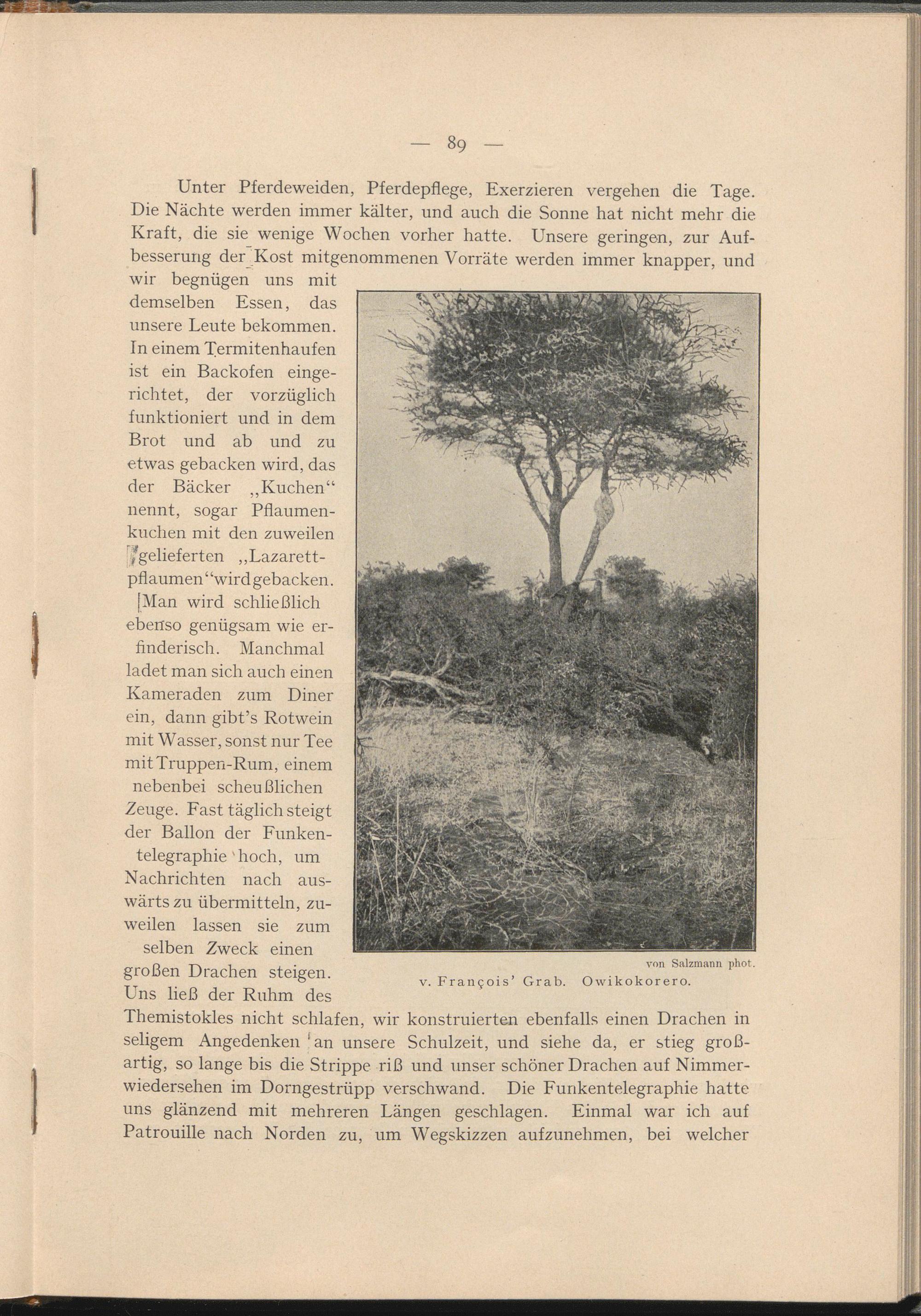 [Man wird schließlich ebenso genügsam wie erfinderisch. Manchmal ladet man sich auch einen Kameraden zum Diner ein, dann gibt’s Rotwein mit Wasser, sonst nur Tee mitTruppen-Rum, einem nebenbei scheußlichen Zeuge. Fast täglich steigt der Ballon der Funkentelegraphie'hoch, um Nachrichten nach auswärts zu übermitteln, zuweilen lassen sie zum selben Zweck einen großen Drachen steigen.