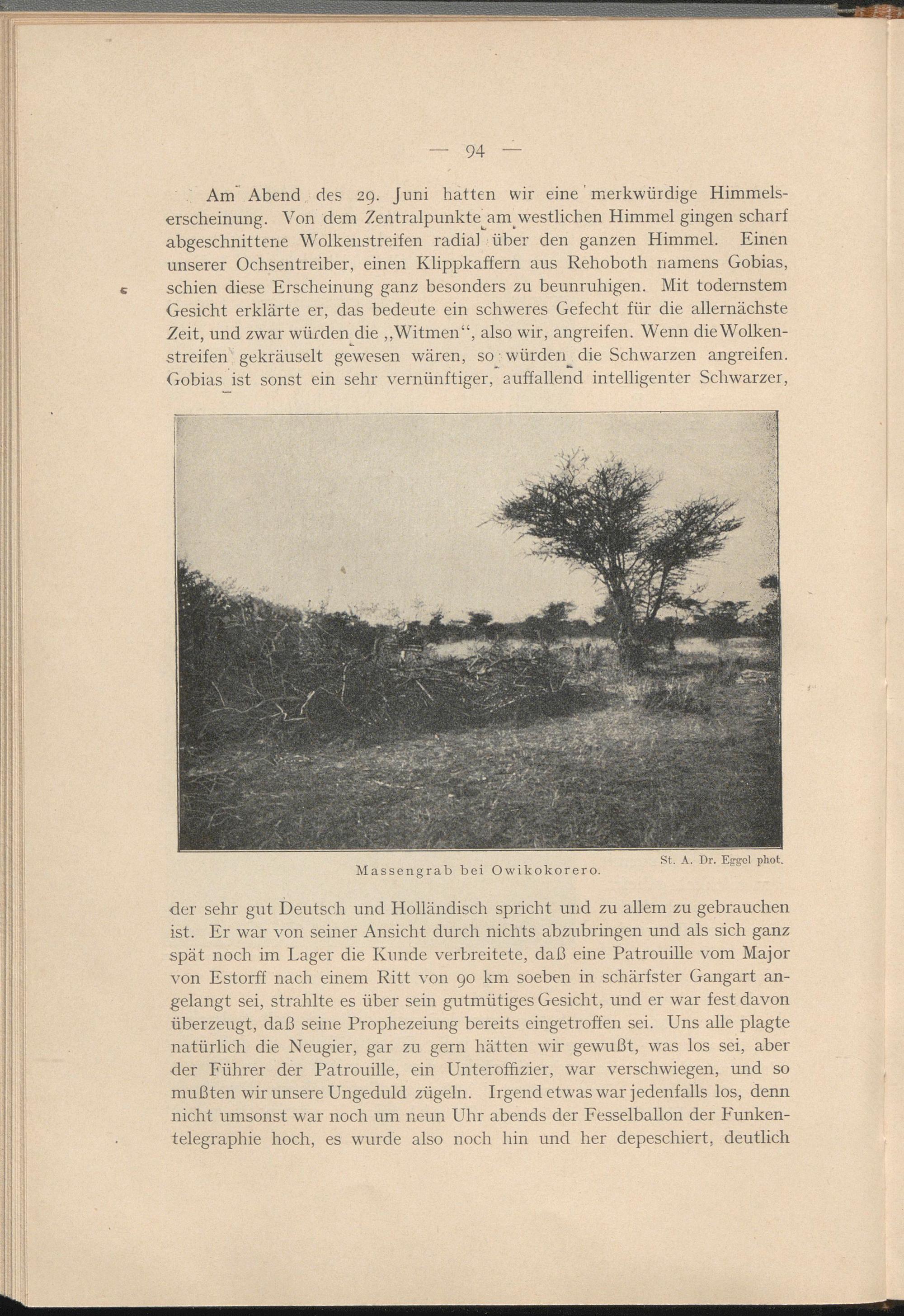 Am Abend des 29. Juni hatten wir eine' merkwürdige Himmelserscheinung. Von dem Zentralpunkte^am_ westlichen Himmel gingen scharf abgeschnittene Wolkenstreifen radial über den ganzen Himmel. Einen unserer Ochsentreiber, einen Klippkaffern aus Rehoboth namens Gobias, schien diese Erscheinung ganz besonders zu beunruhigen. Mit todernstem Gesicht erklärte er, das bedeute ein schweres Gefecht für die allernächste Zeit, und zwar würden die „Witmen“, also wir, angreifen. Wenn die Wolkenstreifen gekräuselt gewesen wären, so • würden die Schwarzen angreifen. Gobias ist sonst ein sehr vernünftiger, auffallend intelligenter Schwarzer,