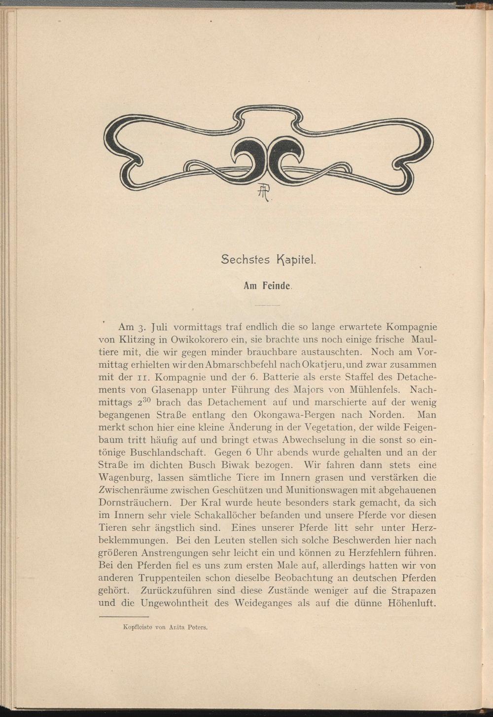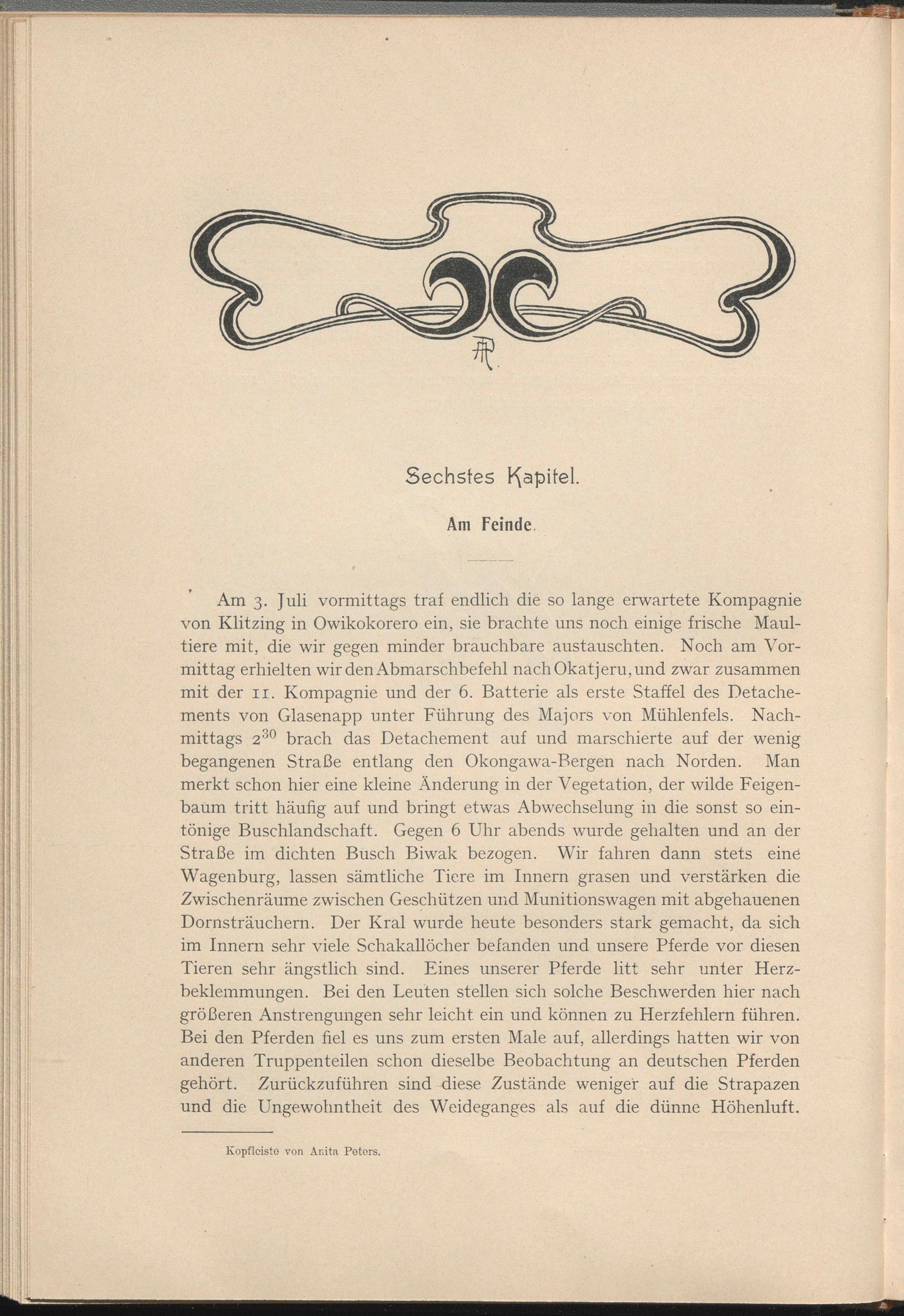 Am 3. Juli vormittags traf endlich die so lange erwartete Kompagnie von Klitzing in Owikokorero ein, sie brachte uns noch einige frische Maultiere mit, die wir gegen minder brauchbare austauschten. Noch am Vormittag erhielten wir den Abmarschbefehl nachOkatjeru,uird zwar zusammen mit der 11. Kompagnie und der 6. Batterie als erste Staffel des Detachements von Glasenapp unter Führung des Majors von Mühlenfels. Nachmittags 2 30 brach das Detachement auf und marschierte auf der wenig begangenen Straße entlang den Okongawa-Bergen nach Norden. Man merkt schon hier eine kleine Änderung in der Vegetation, der wilde Feigenbaum tritt häufig auf und bringt etwas Abwechselung in die sonst so eintönige Buschlandschaft. Gegen 6 Uhr abends wurde gehalten und an der Straße im dichten Busch Biwak bezogen. Wir fahren dann stets eine Wagenburg, lassen sämtliche Tiere im Innern grasen und verstärken die Zwischenräume zwischen Geschützen und Munitionswagen mit abgehauenen Dornsträuchern. Der Kral wurde heute besonders stark gemacht, da sich im Innern sehr viele Schakallöcher befanden und unsere Pferde vor diesen Tieren sehr ängstlich sind. Eines unserer Pferde litt sehr unter Herzbeklemmungen. Bei den Leuten stellen sich solche Beschwerden hier nach größeren Anstrengungen sehr leicht ein und können zu Herzfehlern führen. Bei den Pferden fiel es uns zum ersten Male auf, allerdings hatten wir von anderen Truppenteilen schon dieselbe Beobachtung an deutschen Pferden gehört. Zurückzuführen sind diese Zustände weniger auf die Strapazen und die Ungewohntheit des Weideganges als auf die dünne Höhenluft.
