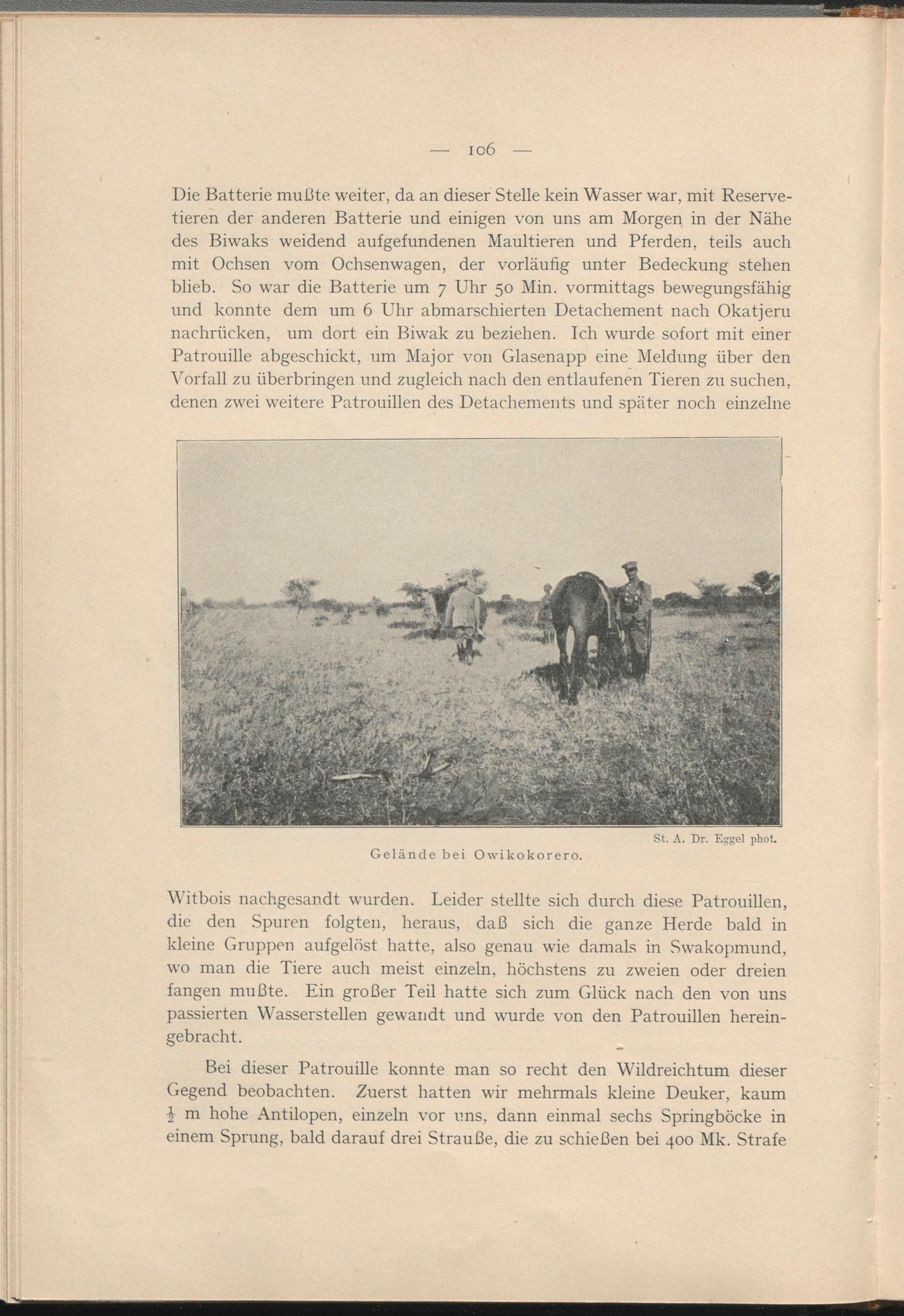 Die Batterie mußte weiter, da an dieser Stelle kein Wasser war, mit Reservetieren der anderen Batterie und einigen von uns am Morgen in der Nähe des Biwaks weidend aufgefundenen Maultieren und Pferden, teils auch mit Ochsen vom Ochsenwagen, der vorläufig unter Bedeckung stehen blieb. So war die Batterie um 7 Uhr 50 Min. vormittags bewegungsfähig und konnte dem um 6 Uhr abmarschierten Detachement nach Okatjeru nachrücken, um dort ein Biwak zu beziehen. Ich wurde sofort mit einer Patrouille abgeschickt, um Major von Glasenapp eine Meldung über den Vorfall zu überbringen und zugleich nach den entlaufenen Tieren zu suchen, denen zwei weitere Patrouillen des Detachements und später noch einzelne