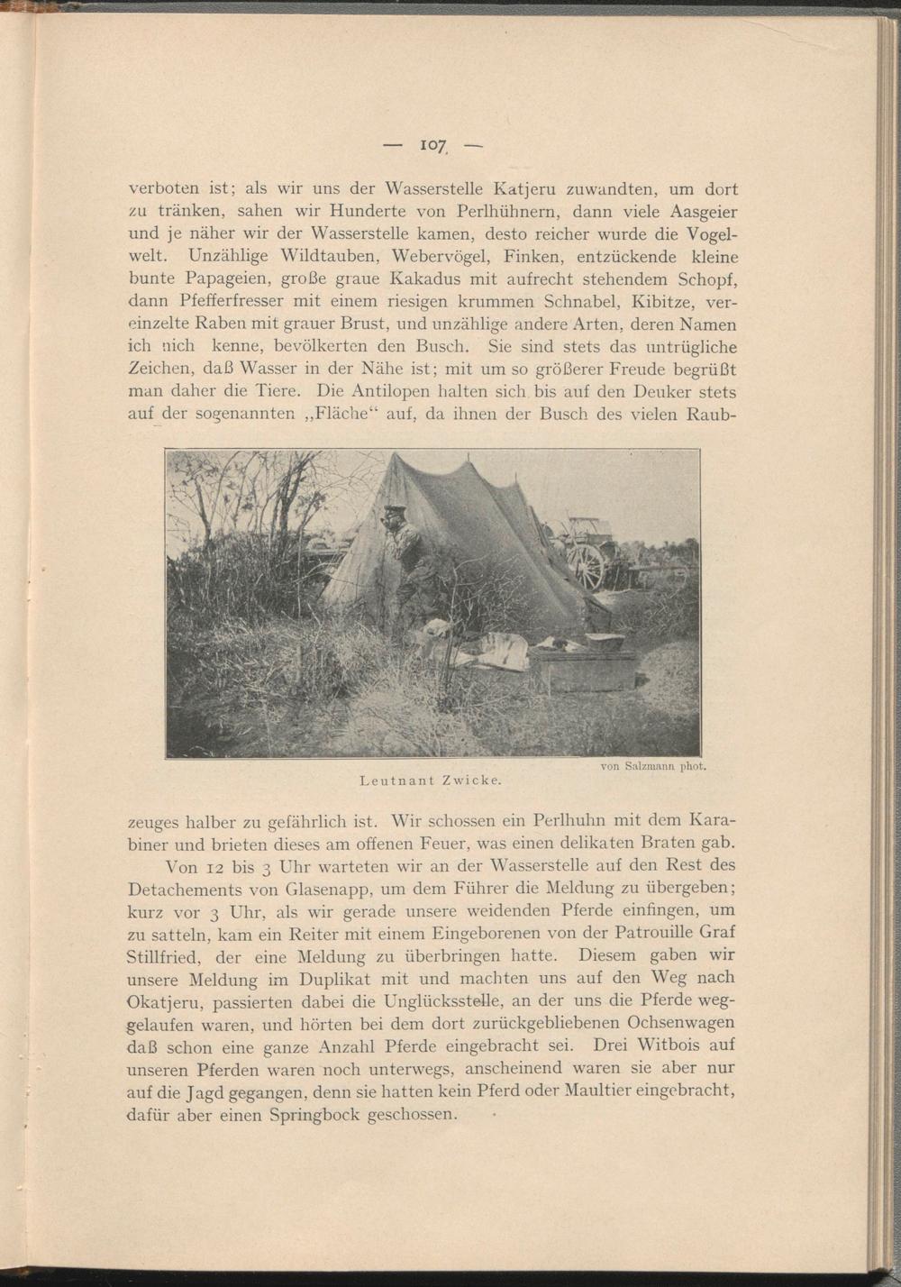 Von 12 bis 3 Uhr warteten wir an der Wasserstelle auf den Rest des Detachements von Glasenapp, um dem Führer die Meldung zu übergeben; kurz vor 3 Uhr, als wir gerade unsere weidenden Pferde einfingen, um zu satteln, kam ein Reiter mit einem Eingeborenen von der Patrouille Graf Stillfried, der eine Meldung zu überbringen hatte. Diesem gaben wir unsere Meldung im Duplikat mit und machten uns auf den Weg nach Okatjeru, passierten dabei die Unglücksstelle, an der uns die Pferde weggelaufen waren, und hörten bei dem dort zurückgebliebenen Ochsenwagen daß schon eine ganze Anzahl Pferde eingebracht sei. Drei Witbois auf unseren Pferden waren noch unterwegs, anscheinend waren sie aber nur auf die Jagd gegangen, denn sie hatten kein Pferd oder Maultier eingebracht, dafür aber einen Springbock geschossen.