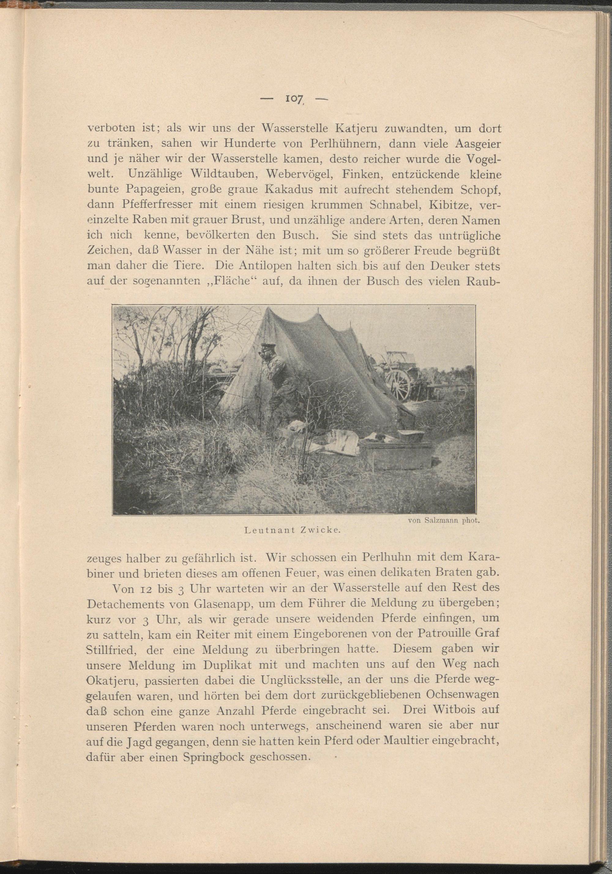 verboten ist; als wir uns der Wasserstelle Katjeru zuwandten, um dort zu tränken, sahen wir Hunderte von Perlhühnern, dann viele Aasgeier und je näher wir der Wasserstelle kamen, desto reicher wurde die Vogelwelt. Unzählige Wildtauben, Webervögel, Finken, entzückende kleine bunte Papageien, große graue Kakadus mit aufrecht stehendem Schopf, dann Pfefferfresser mit einem riesigen krummen Schnabel, Kibitze, vereinzelte Raben mit grauer Brust, und unzählige andere Arten, deren Namen ich nich kenne, bevölkerten den Busch. Sie sind stets das untrügliche Zeichen, daß Wasser in der Nähe ist; mit um so größerer Freude begrüßt man daher die Tiere. Die Antilopen halten sich bis auf den Deuker stets auf der sogenannten „Fläche“ auf, da ihnen der Busch des vielen Raub-