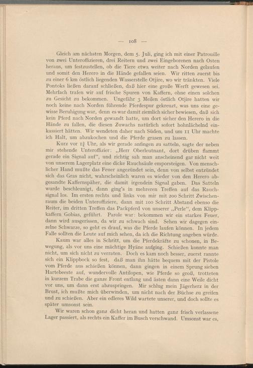 Kurz vor if- Uhr, als wir gerade anfingen zu satteln, sagte der neben mir stehende Unteroffizier: „Herr Oberleutnant, dort drüben flammt gerade ein Signal auf“, und richtig sah man anscheinend gar nicht weit von unserem Lagerplatz eine dicke Rauchsäule emporsteigen. Von menschlicher Hand mußte das Feuer angezündet sein, denn von selbst entzündet sich das Gras nicht, wahrscheinlich waren es wieder von den Herero ab- gesandte Kaffernspäher, die damit irgendein Signal gaben. Das Satteln wurde beschleunigt, dann ging’s in mehreren Treffen auf das Rauchsignal los. Im ersten rechts und links von mir mit 200 Schritt Zwischenraum die beiden Unteroffiziere, dann mit 100 Schritt Abstand ebenso die Reiter, im dritten Treffen das Packpferd von unserer „Perle“, dem Klipp- kaffern Gobias, geführt. Parole war: bekommen wir ein starkes Feuer, dann wird ausgerissen, da wir zu schwach sind. Sehen wir dagegen einzelne Schwarze, so geht es drauf, was die Pferde laufen können. In jedem Falle sollten die Leute auf mich sehen, da ich die Richtung angeben würde.