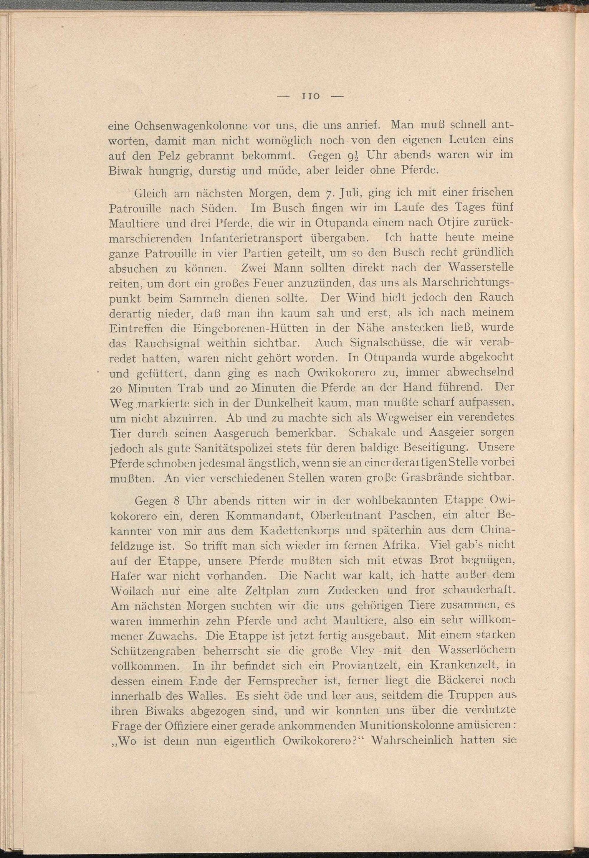 Gleich am nächsten Morgen, dem 7. Juli, ging ich mit einerfrischen Patrouille nach Süden. Im Busch fingen wir im Laufe des Tages fünf Maultiere und drei Pferde, die wir in Otupanda einem nach Otjire zurückmarschierenden Infanterietransport übergaben. Ich hatte heute meine ganze Patrouille in vier Partien geteilt, um so den Busch recht gründlich absuchen zu können. Zwei Mann sollten direkt nach der Wasserstelle reiten, um dort ein großes Feuer anzuzünden, das uns als Marschrichtungspunkt beim Sammeln dienen sollte. Der Wind hielt jedoch den Rauch derartig nieder, daß man ihn kaum sah und erst, als ich nach meinem Eintreffen die Eingeborenen-Hütten in der Nähe anstecken ließ, wurde das Rauchsignal weithin sichtbar. Auch Signalschüsse, die wir verabredet hatten, waren nicht gehört worden. In Otupanda wurde abgekocht und gefüttert, dann ging es nach Owikokorero zu, immer abwechselnd 20 Minuten Trab und 20 Minuten die Pferde an der Hand führend. Der Weg markierte sich in der Dunkelheit kaum, man mußte scharf aufpassen, um nicht abzuirren. Ab und zu machte sich als Wegweiser ein verendetes Tier durch seinen Aasgeruch bemerkbar. Schakale und Aasgeier sorgen jedoch als gute Sanitätspolizei stets für deren baldige Beseitigung. Unsere Pferde schnoben jedesmal ängstlich, wenn sie an einer derartigen Stelle vorbei mußten. An vier verschiedenen Stellen waren große Grasbrände sichtbar.