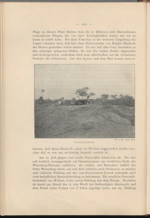 Plage an diesem Platz blieben stets die in Millionen und Abermillionen vorhandenen Fliegen, die von einer Zudringlichkeit waren, wie ich sie kaum je erlebt habe. Bei einer Umschau in der weiteren Umgebung des Lagers erkannte man, daß hier eben Zehntausende von Köpfen Rindvieh der Herero gestanden haben müssen. Es war fast alles Gras, besonders an den günstiger gelegenen Stellen, bis auf den kahlen Boden abgeweidet und niedergetreten, außerdem stieß man allenthalben auf die verlassenen Pontoks der Schwarzen. Aus den Spuren und dem Mist konnte man er-