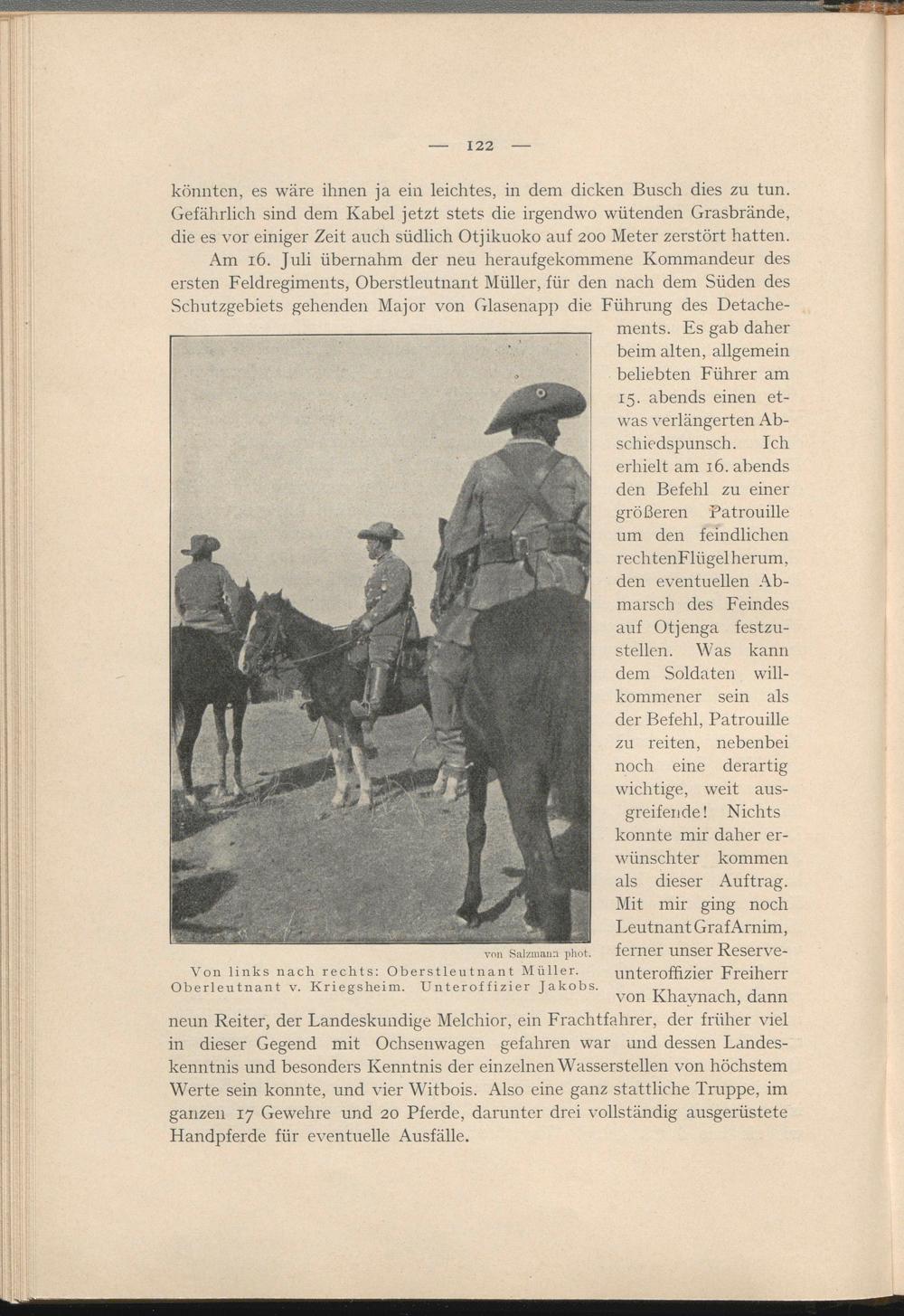 Am 16. Juli übernahm der neu heraufgekommene Kommandeur des ersten Feldregiments, Oberstleutnant Müller, für den nach dem Süden des Schutzgebiets gehenden Major von Glasenapp die Führung des Detachements. Es gab daher beim alten, allgemein beliebten Führer am 15. abends einen etwas verlängerten Abschiedspunsch . Ich erhielt am 16. abends den Befehl zu einer größeren Patrouille um den feindlichen rech tenFliigel herum, den eventuellen Abmarsch des Feindes auf Otjenga festzustellen. Was kann dem Soldaten willkommener sein als der Befehl, Patrouille zu reiten, nebenbei noch eine derartig wichtige, weit ausgreifende! Nichts konnte mir daher erwünschter kommen als dieser Auftrag. Mit mir ging noch Leutnant Graf Arnim, ferner unser Reserveunteroffizier Freiherr von Khavnach, dann neun Reiter, der Landeskundige Melchior, ein Frachtfahrer, der früher viel in dieser Gegend mit Ochsenwagen gefahren war und dessen Landeskenntnis und besonders Kenntnis der einzelnen Wasserstellen von höchstem Werte sein konnte, und vier Witbois. Also eine ganz stattliche Truppe, im ganzen 17 Gewehre und 20 Pferde, darunter drei vollständig ausgerüstete Handpferde für eventuelle Ausfälle.