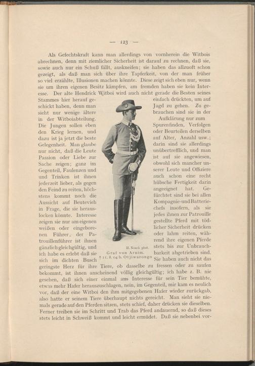 bekommt, ist ihnen anscheinend völlig gleichgültig; ich habe z. B. nie gesehen, daß sich einer einmal aus Interesse für sein Tier bemühte, etwas mehr Hafer herauszuschlagen, nein, im Gegenteil, mir kam es neulich vor, daß der eine Witboi den ihm mitgegebenen Hafer wieder zurückgab, also hatte er seinem Tiere überhaupt nichts gereicht. Man sieht sie niemals gerade auf den Pferden sitzen, stets schief, daher drücken sie dieselben. Ferner treiben sie im Schritt und Trab das Pferd andauernd, so daß dieses stets leicht in Schweiß kommt und leicht ermüdet. Daß sie nebenbei vor-