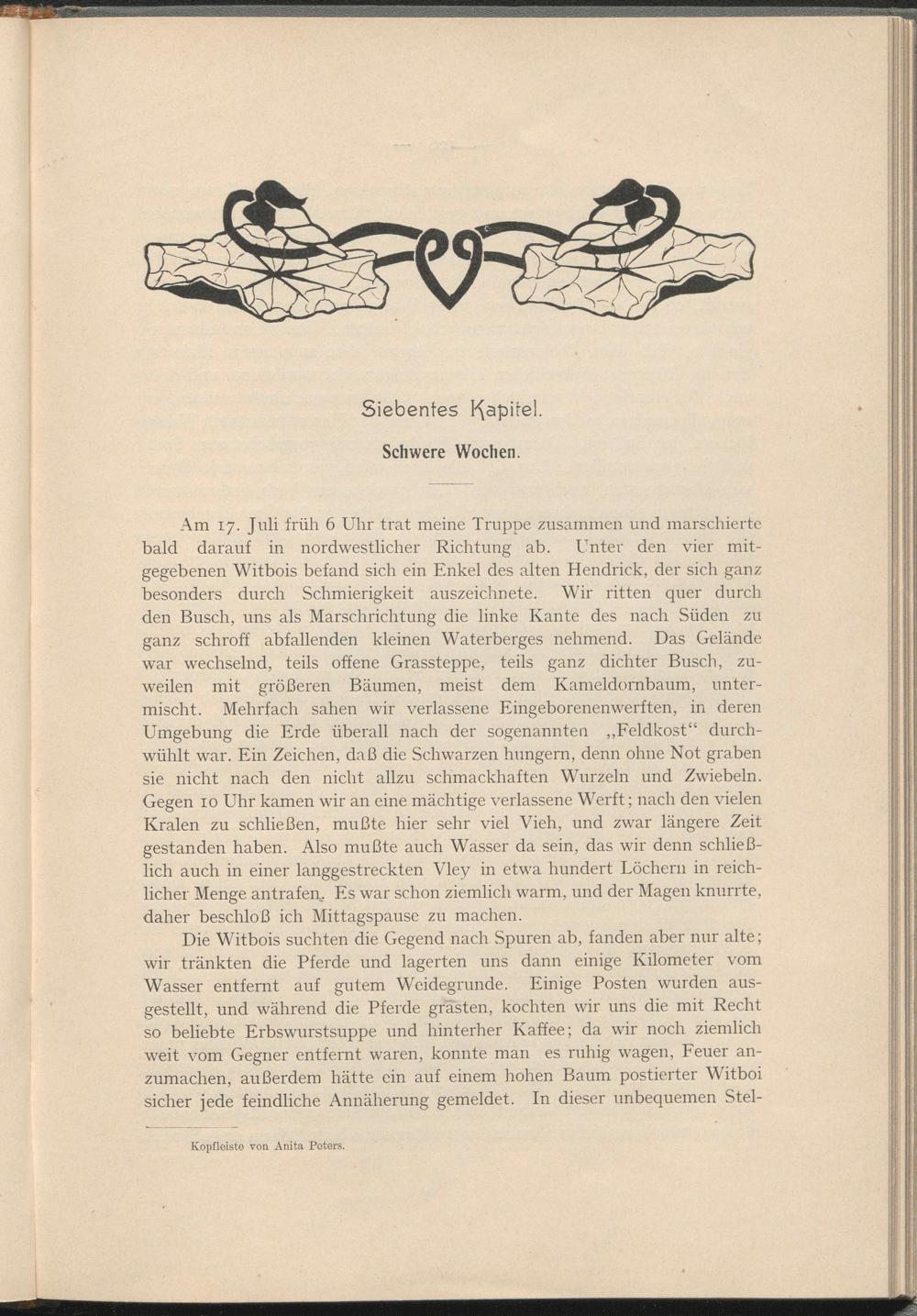 Am 17. Juli früh 6 Uhr trat meine Truppe zusammen und marschierte bald darauf in nordwestlicher Richtung ab. Unter den vier mitgegebenen Witbois befand sich ein Enkel des alten Hendrick, der sich ganz besonders durch Schmierigkeit auszeichnete. Wir ritten quer durch den Busch, uns als Marschrichtung die linke Kante des nach Süden zu ganz schroff abfallenden kleinen Waterberges nehmend. Das Gelände war wechselnd, teils offene Grassteppe, teils ganz dichter Busch, zuweilen mit größeren Bäumen, meist dem Kameldornbaum, untermischt. Mehrfach sahen wir verlassene Eingeborenenwerften, in deren Umgebung die Erde überall nach der sogenannten „Feldkost“ durchwühlt war. Ein Zeichen, daß die Schwarzen hungern, denn ohne Not graben sie nicht nach den nicht allzu schmackhaften Wurzeln und Zwiebeln. Gegen 10 Uhr kamen wir an eine mächtige verlassene Werft; nach den vielen Kralen zu schließen, mußte hier sehr viel Vieh, und zwar längere Zeit gestanden haben. Also mußte auch Wasser da sein, das wir denn schließlich auch in einer langgestreckten Vley in etwa hundert Löchern in reichlicher Menge antrafen. Es war schon ziemlich warm, und der Magen knurrte, daher beschloß ich Mittagspause zu machen.