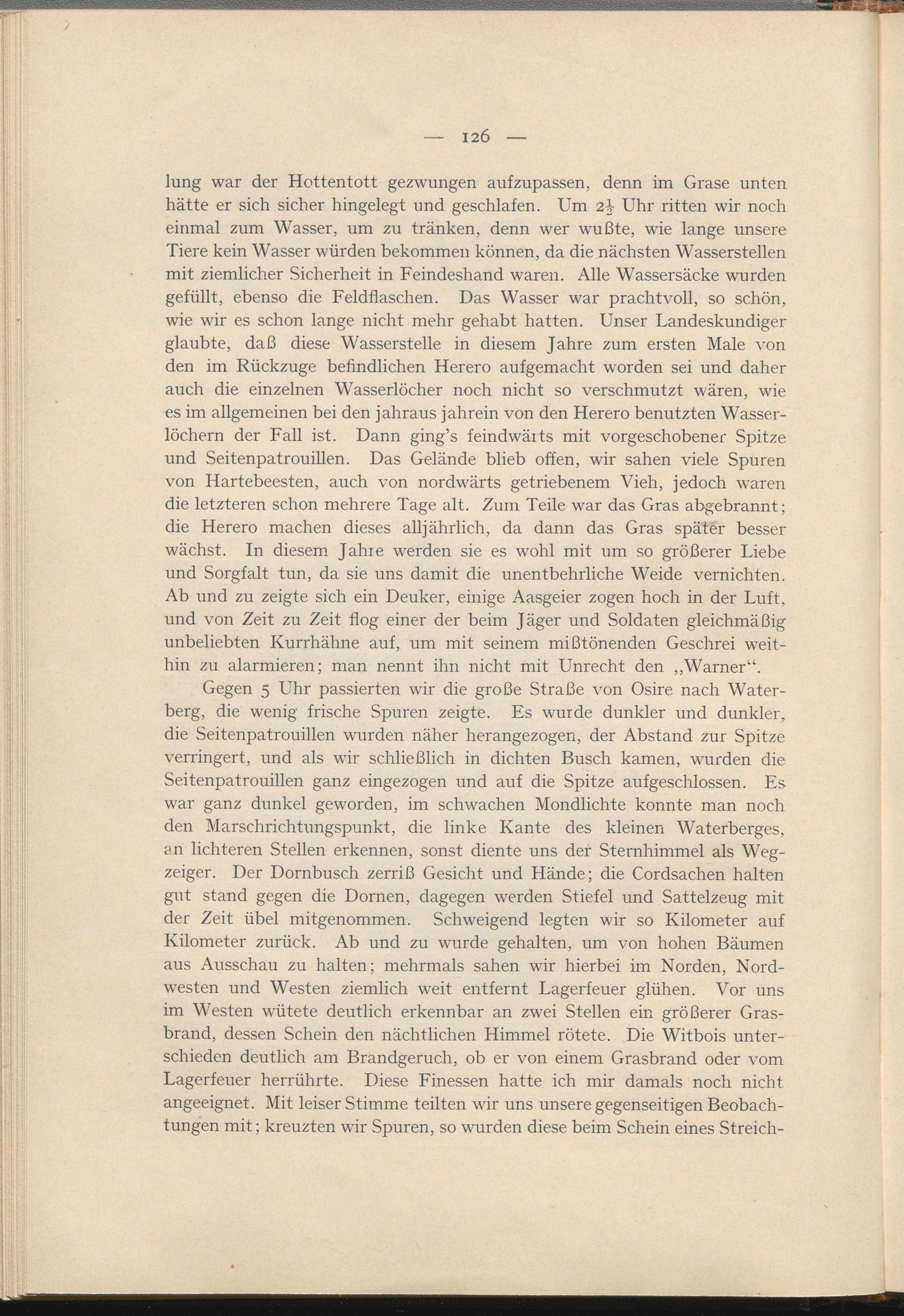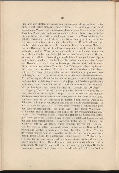 lung war der Hottentott gezwungen aufzupassen, denn im Grase unten hätte er sich sicher hingelegt und geschlafen. Um 2 } Uhr ritten wir noch einmal zum Wasser, um zu tränken, denn wer wußte, wie lange unsere Tiere kein Wasser würden bekommen können, da die nächsten Wasserstellen mit ziemlicher Sicherheit in Feindeshand waren. Alle Wassersäcke wurden gefüllt, ebenso die Feldflaschen. Das Wasser war prachtvoll, so schön, wie wir es schon lange nicht mehr gehabt hatten. Unser Landeskundiger glaubte, daß diese Wasserstelle in diesem Jahre zum ersten Male von den im Rückzuge befindlichen Herero aufgemacht worden sei und daher auch die einzelnen Wasserlöcher noch nicht so verschmutzt wären, wie es im allgemeinen bei den jahraus jahrein von den Herero benutzten Wasserlöchern der Fall ist. Dann ging’s feindwärts mit vorgeschobener Spitze und Seitenpatrouillen. Das Gelände blieb offen, wir sahen viele Spuren von Hartebeesten, auch von nordwärts getriebenem Vieh, jedoch waren die letzteren schon mehrere Tage alt. Zum Teile war das Gras abgebrannt; die Herero machen dieses alljährlich, da dann das Gras später besser wächst. In diesem Jahie werden sie es wohl mit um so größerer Liebe und Sorgfalt tun, da sie uns damit die unentbehrliche Weide vernichten. Ab und zu zeigte sich ein Deuker, einige Aasgeier zogen hoch in der Luft, und von Zeit zu Zeit flog einer der beim Jäger und Soldaten gleichmäßig unbeliebten Kurrhähne auf, um mit seinem mißtönenden Geschrei weithin zu alarmieren; man nennt ihn nicht mit Unrecht den „Warner“.