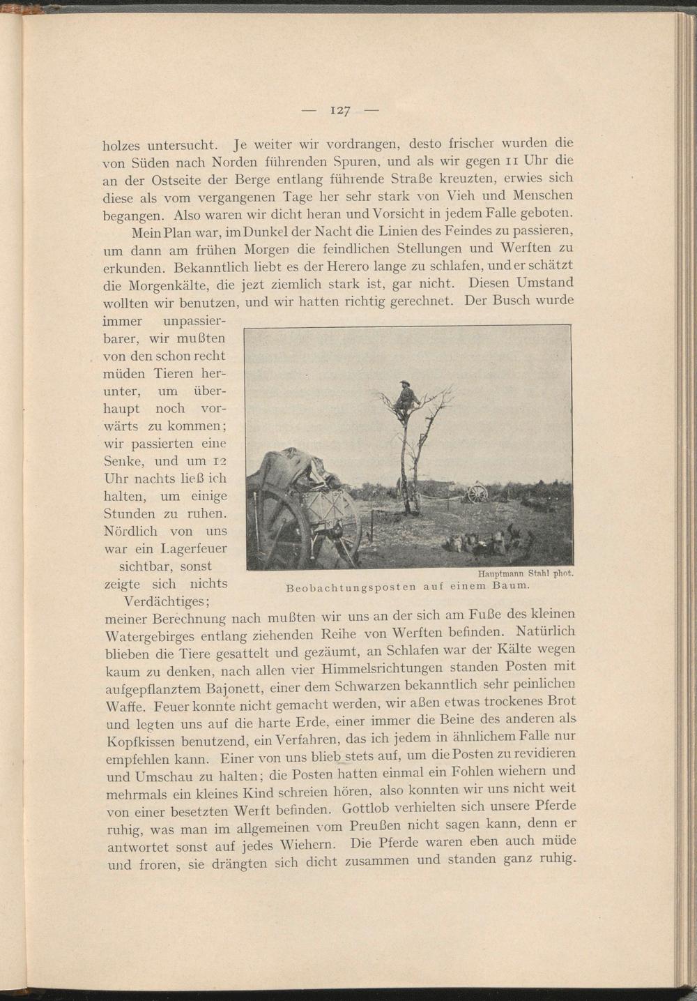 MeinPlan war, imDunkel der Nacht die Linien des Feindes zu passieren, um dann am frühen Morgen die feindlichen Stellungen und Werften zu erkunden. Bekanntlich liebt es der Herero lange zu schlafen, und er schätzt die Morgenkälte, die jezt ziemlich stark ist, gar nicht. Diesen Umstand wollten wir benutzen, und wir hatten richtig gerechnet. Der Busch wurde immer unpassierbarer, wir mußten von den schon recht müden Tieren herunter, um überhaupt noch vorwärts zu kommen; wir passierten eine Senke, und um 12 Uhr nachts ließ ich halten, um einige Stunden zu ruhen.