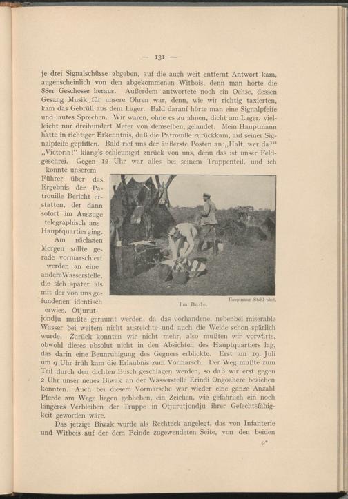 jondju mußte geräumt werden, da das vorhandene, nebenbei miserable Wasser bei weitem nicht ausreichte und auch die Weide schon spärlich wurde. Zurück konnten wir nicht mehr, also mußten wir vorwärts, obwohl dieses absolut nicht in den Absichten des Hauptquartiers lag, das darin eine Beunruhigung des Gegners erblickte. Erst am 19. Juli um 9 Uhr früh kam die Erlaubnis zum Vormarsch. Der Weg mußte zum Teil durch den dichten Busch geschlagen werden, so daß wir erst gegen 2 Uhr unser neues Biwak an der Wasserstelle Erindi Ongoahere beziehen konnten. Auch bei diesem Vormarsche war wieder eine ganze Anzahl Pferde am Wege liegen geblieben, ein Zeichen, wie gefährlich ein noch längeres Verbleiben der Truppe in Otjurutjondju ihrer Gefechtsfähigkeit geworden wäre.