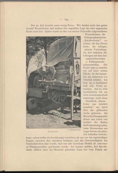 1 Wasserlöchern die Heliographenstation „Rückfortturm“ errichtet, die den Zweck hatte, die heliogra- phische Verbindung der drei östlichen Abteilungen mit dem heranmarschierenden 2. Feldregimen te sicherzustellen. Die Nacht zum 23. rasteten wir auf einer weiten Fläche, da das immerhin am sichersten vor Überfall schützt. Ich ließ, da es barbarisch kalt war, Feuer anmachen. Am 23. früh marschierten wir zurück, Graf Arnim schoß unterwegs noch einen Steinbock, dessen Leber uns köstlich mundete" am Spieß über der glühenden Asche gebraten. Als Marschrichtungspunkt diente uns schon von weither der Ballon derFunkentelegraphie, beim Heranreiten ans Lager hörten wir plötzlich lebhaftes Gewehrfeuer; schon wollte ich beschleunigt vorrücken, als uns aus den regelmäßigen Pausen zwischen den einzelnen Schüssen und der Gleichmäßigkeit des Geschoßpfeifens klar wurde, daß nur mit Gewehren Modell 98, und zwar zu Übungszwecken, geschossen wurde. Ich konnte melden, daß das Gelände südlich einer bis Okateitei gehenden Linie frei vom Feinde sei.