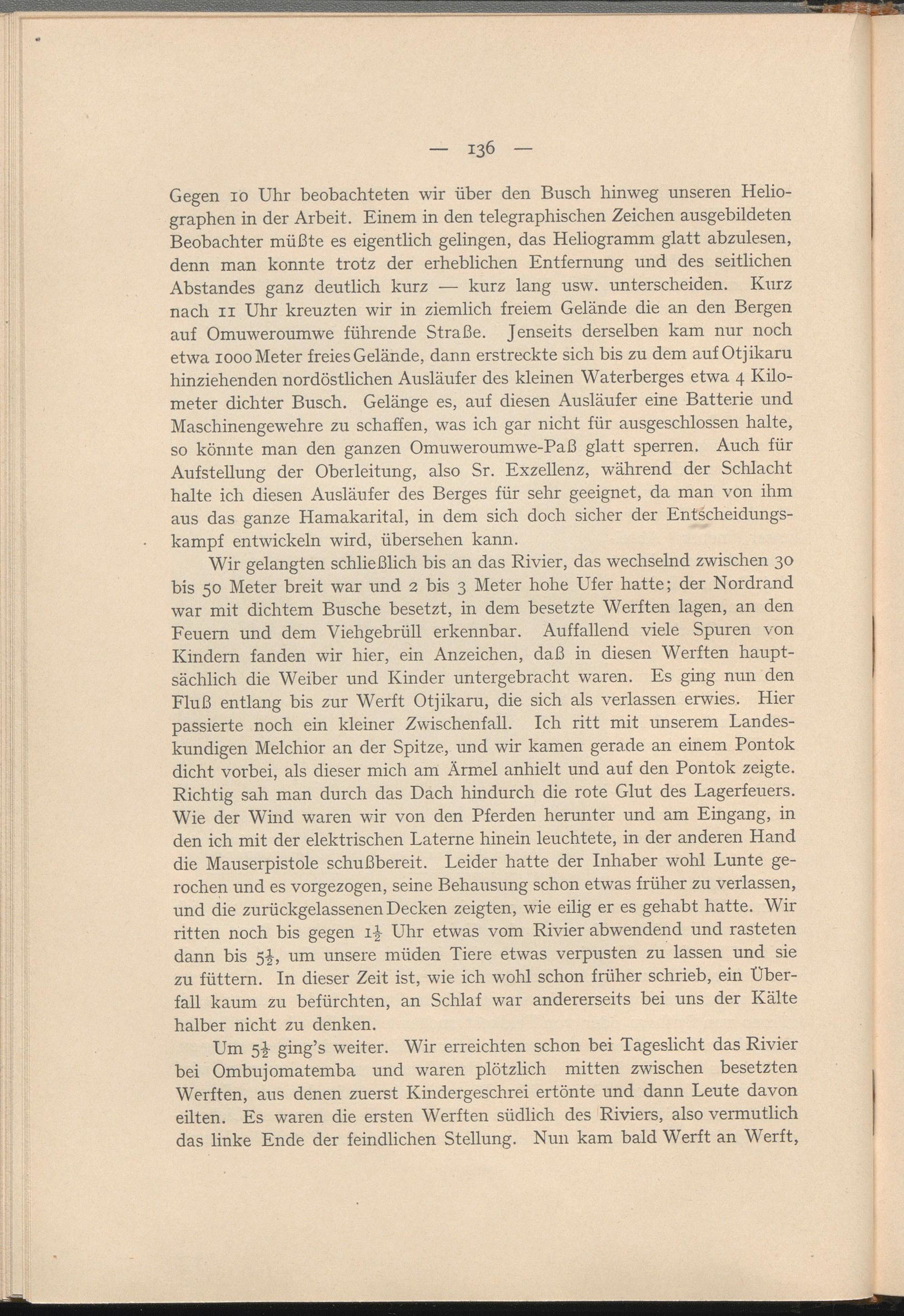 Gegen io Uhr beobachteten wir über den Busch hinweg unseren Heliographen in der Arbeit. Einem in den telegraphischen Zeichen ausgebildeten Beobachter müßte es eigentlich gelingen, das Heliogramm glatt abzulesen, denn man konnte trotz der erheblichen Entfernung und des seitlichen Abstandes ganz deutlich kurz — kurz lang usw. unterscheiden. Kurz nach ii Uhr kreuzten wir in ziemlich freiem Gelände die an den Bergen auf Omuweroumwe führende Straße. Jenseits derselben kam nur noch etwa iooo Meter freies Gelände, dann erstreckte sich bis zu dem auf Otjikaru hinziehenden nordöstlichen Ausläufer des kleinen Waterberges etwa 4 Kilometer dichter Busch. Gelänge es, auf diesen Ausläufer eine Batterie und Maschinengewehre zu schaffen, was ich gar nicht für ausgeschlossen halte, so könnte man den ganzen Omuweroumwe-Paß glatt sperren. Auch für Aufstellung der Oberleitung, also Sr. Exzellenz, während der Schlacht halte ich diesen Ausläufer des Berges für sehr geeignet, da man von ihm aus das ganze Hamakarital, in dem sich doch sicher der Entscheidungskampf entwickeln wird, übersehen kann.