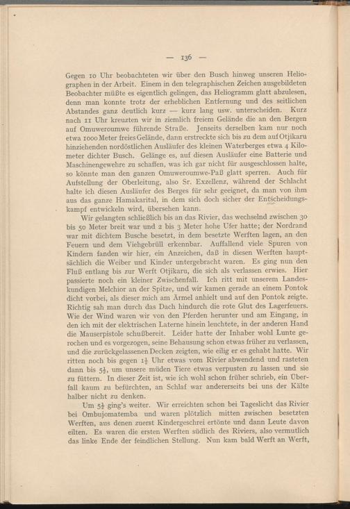 Um 5-J- ging’s weiter. Wir erreichten schon bei Tageslicht das Rivier bei Ombujomatemba und waren plötzlich mitten zwischen besetzten Werften, aus denen zuerst Kindergeschrei ertönte und dann Leute davon eilten. Es waren die ersten Werften südlich des Riviers, also vermutlich das linke Ende der feindlichen Stellung. Nun kam bald Werft an Werft,