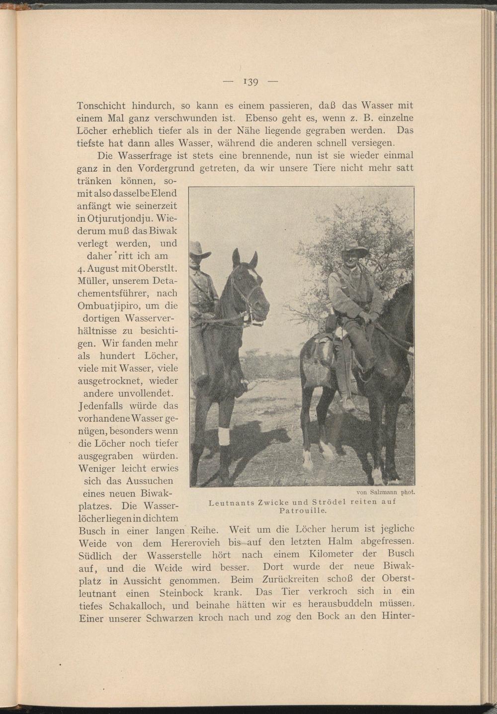 Die Wasserfrage ist stets eine brennende, nun ist sie wieder einmal ganz in den Vordergrund getreten, da wir unsere Tiere nicht mehr satt tränken können, somit also dasselbe Elend anfängt wie seinerzeit inOtjurutjondju. Wiederum muß das Biwak verlegt werden, und daher' ritt ich am 4. August mitOberstlt.