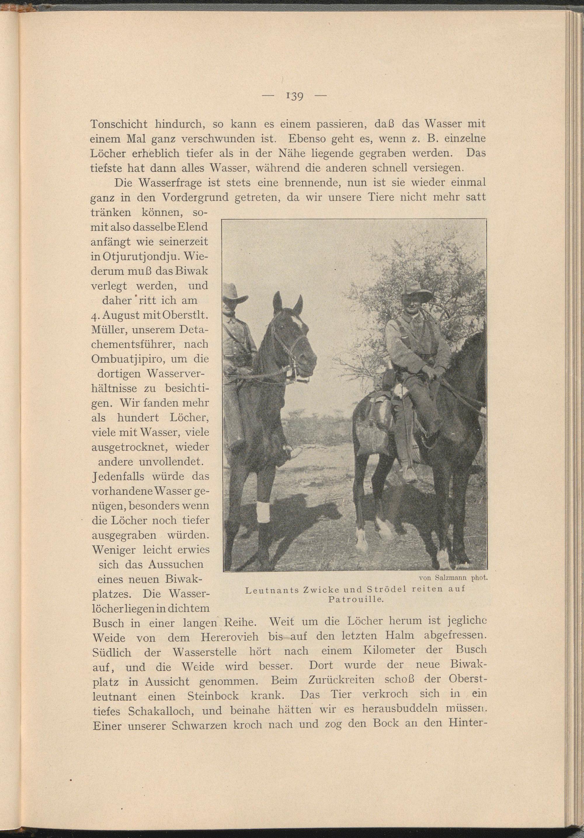 Müller, unserem Detachementsführer, nach Ombuatjipiro, um die dortigen Wasserver- hältnisse zu besichtigen. Wir fanden mehr als hundert Löcher, viele mit Wasser, viele ausgetrocknet, wieder andere unvollendet.