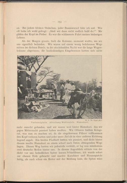 mehr zurecht gefunden, und wir waren weit hinter Hamakari, das wir gegen Mitternacht passiert haben mußten. Wir Offiziere hielten Kriegsrat, was nun zu machen sei, da die eingeborenen Führer vollkommen den Kopf verloren hatten und jeder unser Ziel als in einer anderen Richtung liegend angab. Ein breites Flußbett hatten wir passiert, und dicht hinter diesem mußte Hamakari an einem scharf nach Osten abbiegenden Wege liegen. Diesen Weg hatten wir jedenfalls verfehlt, er lag nun mindestens zwei deutsche Meilen hinter uns. In diesem Augenblick ertönte von der dicht vor uns befindlichen Spitze kurzes Schnellfeuer, ich wurde sofort zur ebenen Erde gebracht und machte Karabiner und Mauserpistole fertig, als auch schon ein Reiter mit der Meldung kam, die Spitze wäre