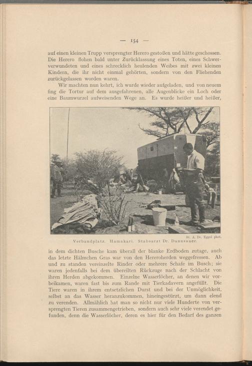 auf einen kleinen Trupp versprengter Herero gestoßen und hätte geschossen. Die Herero flohen bald unter Zurücklassung eines Toten, eines Schwerverwundeten und eines schrecklich heulenden Weibes mit zwei kleinen Kindern, die ihr nicht einmal gehörten, sondern von den Fliehenden zurückgelassen worden waren.