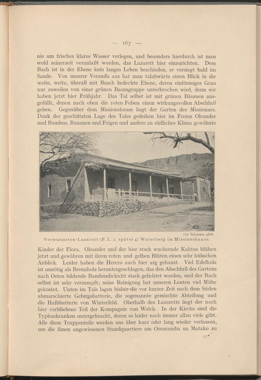 Kinder der Flora. Oleander und der hier stark wuchernde Kaktus blühen jetzt und gewähren mit ihren roten und gelben Blüten einen sehr hübschen Anblick. Leider haben die Herero auch hier arg gehaust. Viel Edelholz ist unnötig als Brennholz heruntergeschlagen, das den Abschluß des Gartens nach Osten bildende Bambusdickicht stark gelichtet worden, und der Bach selbst ist sehr versumpft; seine Reinigung hat unseren Leuten viel Mühe gekostet. Unten im Tale lagen bisher die vor kurzer Zeit nach dem Süden abmarschierte Gebirgsbatterie, die sogenannte gemischte Abteilung und die Halbbatterie von Winterfeld. Oberhalb des Lazaretts liegt der noch hier verbliebene Teil der Kompagnie von Welck. In der Kirche sind die Typhuskranken untergebracht, deren es leider noch immer allzu viele gibt. Alle diese Truppenteile werden uns über kurz oder lang wieder verlassen, um die ihnen angewiesenen Standquartiere am Omuramba ua Matako zu