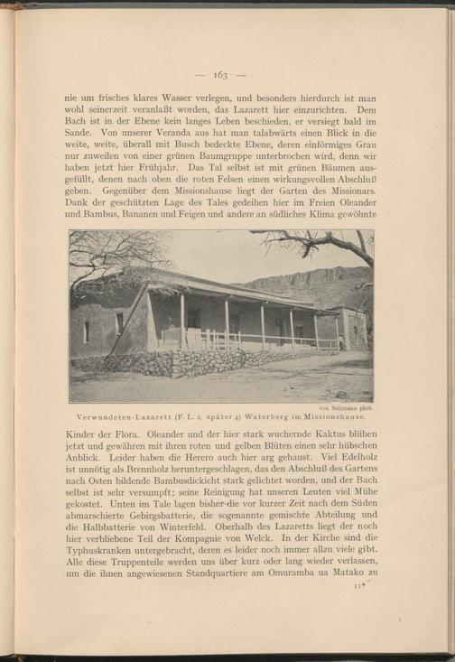 nie um frisches klares Wasser verlegen, und besonders hierdurch ist man wohl seinerzeit veranlaßt worden, das Lazarett hier einzurichten. Dem Bach ist in der Ebene kein langes Leben beschieden, er versiegt bald im Sande. Von unserer Veranda aus hat man talabwärts einen Blick in die weite, weite, überall mit Busch bedeckte Ebene, deren einförmiges Grau nur zuweilen von einer grünen Baumgruppe unterbrochen wird, denn wir haben jetzt hier Frühjahr. Das Tal selbst ist mit grünen Bäumen ausgefüllt, denen nach oben die roten Felsen einen wirkungsvollen Abschluß geben. Gegenüber dem Missionshause liegt der Garten des Missionars. Dank der geschützten Lage des Tales gedeihen hier im Freien Oleander und Bambus, Bananen und Feigen und andere an südliches Klima gewöhnte
