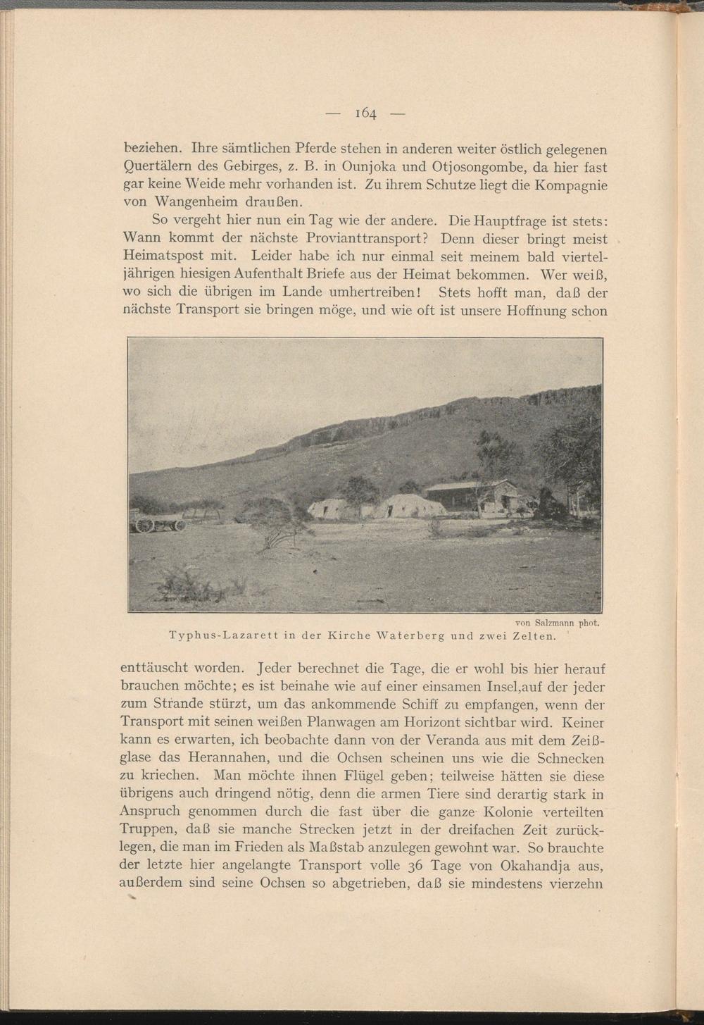 enttäuscht worden. Jeder berechnet die Tage, die er wohl bis hier herauf brauchen möchte; es ist beinahe wie auf einer einsamen Insel,auf der jeder zum Strande stürzt, um das ankommende Schiff zu empfangen, wenn der Transport mit seinen weißen Planwagen am Horizont sichtbar wird. Keiner kann es erwarten, ich beobachte dann von der Veranda aus mit dem Zeiß- glase das Herannahen, und die Ochsen scheinen uns wie die Schnecken zu kriechen. Man möchte ihnen Flügel geben; teilweise hätten sie diese übrigens auch dringend nötig, denn die armen Tiere sind derartig stark in Anspruch genommen durch die fast über die ganze Kolonie verteilten Truppen, daß sie manche Strecken jetzt in der dreifachen Zeit zurücklegen, die man im Frieden als Maßstab anzulegen gewohnt war. So brauchte der letzte hier angelangte Transport volle 36 Tage von Okahandja aus, außerdem sind seine Ochsen so abgetrieben, daß sie mindestens vierzehn