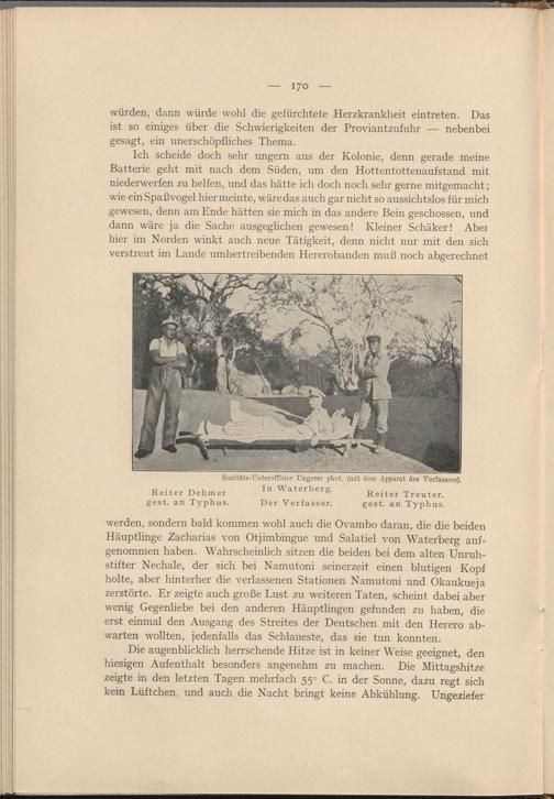 Ich scheide doch sehr ungern aus der Kolonie, denn gerade meine Batterie geht mit nach dem Süden, um den Hottentottenaufstand mit niederwerfen zu helfen, und das hätte ich doch noch sehr gerne mitgemacht; wie einSpaßvogel hiermeinte, wäredas auch gar nicht so aussichtslos für mich gewesen, denn am Ende hätten sie mich in das andere Bein geschossen, und dann wäre ja die Sache ausgeglichen gewesen! Kleiner Schäker! Aber hier im Norden winkt auch neue Tätigkeit, denn nicht nur mit den sich verstreut im Lande umhertreibenden Hererobanden muß noch abgerechnet