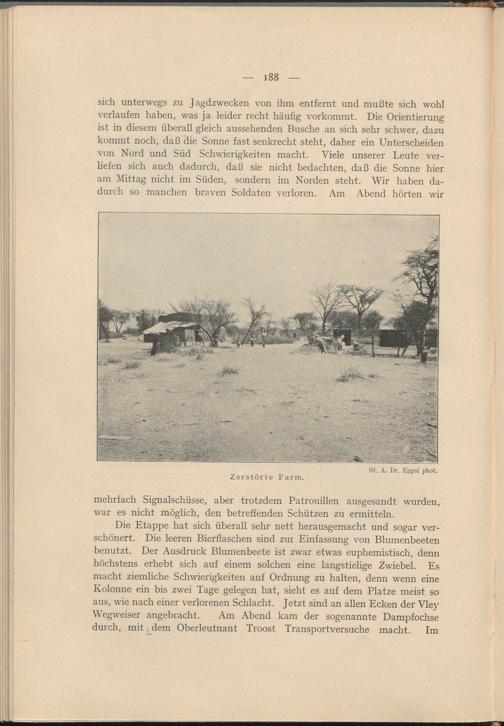 Die Etappe hat sich überall sehr nett herausgemacht und sogar verschönert. Die leeren Bierflaschen sind zur Einfassung von Blumenbeeten benutzt. Der Ausdruck Blumenbeete ist zwar etwas euphemistisch, denn höchstens erhebt sich auf einem solchen eine langstielige Zwiebel. Es macht ziemliche Schwierigkeiten auf Ordnung zu halten, denn wenn eine Kolonne ein bis zwei Tage gelegen hat, sieht es auf dem Platze meist so aus, wie nach einer verlorenen Schlacht. Jetzt sind an allen Ecken der Vley Wegweiser angebracht. Am Abend kam der sogenannte Dampfochse durch, mit, dem Oberleutnant Troost Transportversuche macht. Im