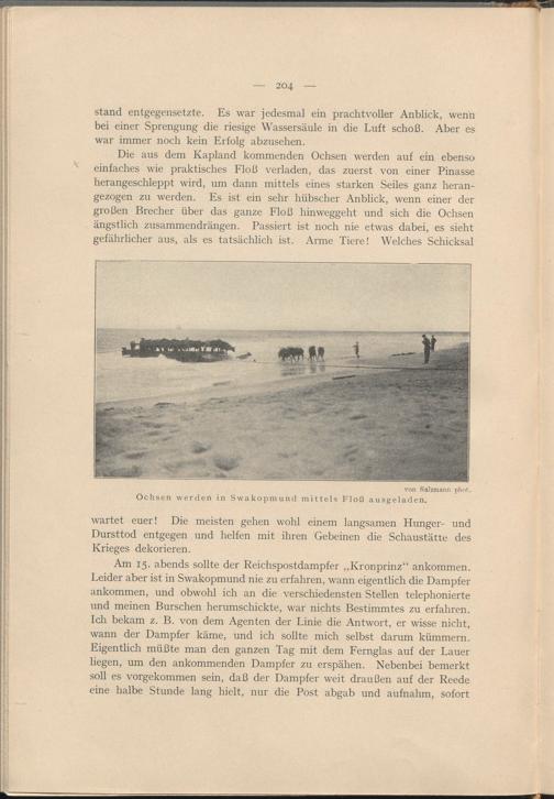 Am 15. abends sollte der Reichspostdampfer „Kronprinz“ ankommen. Leider aber ist in Swakopmund nie zu erfahren, wann eigentlich die Dampfer ankommen, und obwohl ich an die verschiedensten Stellen telephonierte und meinen Burschen herumschickte, war nichts Bestimmtes zu erfahren. Ich bekam z. B. von dem Agenten der Linie die Antwort, er wisse nicht, wann der Dampfer käme, und ich sollte mich selbst darum kümmern. Eigentlich müßte man den ganzen Tag mit dem Fernglas auf der Lauer liegen, um den ankommenden Dampfer zu erspähen. Nebenbei bemerkt soll es vorgekommen sein, daß der Dampfer weit draußen auf der Reede eine halbe Stunde lang hielt, nur die Post abgab und aufnahm, sofort
