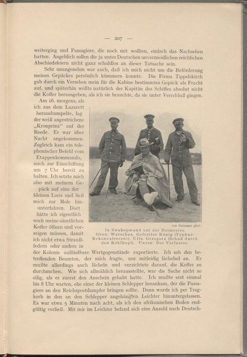 ich aus dem Lazarett heraushumpelte, lag der weiß angestrichene „Kronprinz“ auf der Reede. Er war über Nacht angekommen. Zugleich kam ein telephonischer Befehl vom Etappenkommando, mich zur Einschiffung um 7 Uhr bereit zu halten. Ich setzte mich also mit meinem Gepäck auf eine der kleinen Loris und ließ mich zur Mole hinunterfahren. Dort hätte ich eigentlich noch meine sämtlichen Koffer öffnen und vorzeigen müssen, damit ich nicht etwa Straußfedern oder andere in