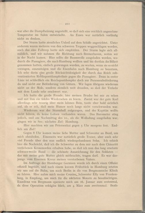 Gegen 8 Uhr kamen meine liebe Mutter und Schwester an Bord, um mich abzuholen. Einerseits war natürlich große Trauer, aber auch sehr viel Freude über den nun endlich wiedergefundenen Sohn. Ich erhielt hier die Nachricht, daß ich die Schwerter zu dem mir nach dem Chinaritt verliehenen Kronenorden erhalten habe, so daß ich nun das lang ersehnte schwarz-weiße Band — die schönste Auszeichnung für den Soldaten — das mir meine gute Mutter gleich mitbrachte, tragen darf. Es war dasjenige vom Eisernen Kreuz meines verstorbenen Vaters.