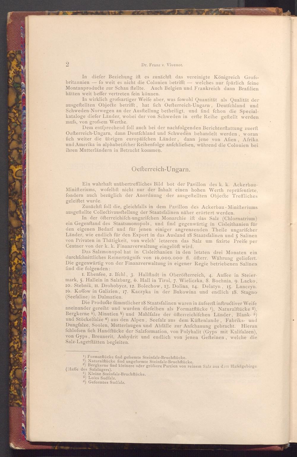 In der öfterreichifch- ungarifchen Monarchie ift das Salz( Chlornatrium) ein Gegenftand des Staatsmonopols, und find gegenwärtig in Cisleithanien für den eigenen Bedarf und für jenen einiger angrenzenden Theile ungarifcher Länder, wie endlich für den Export in das Ausland 18 Staatsfalinen und 5 Salinen von Privaten in Thätigkeit, von welch' letzeren das Salz um fixirte Preife per Centner von der k. k. Finanzverwaltung eingelöft wird.
