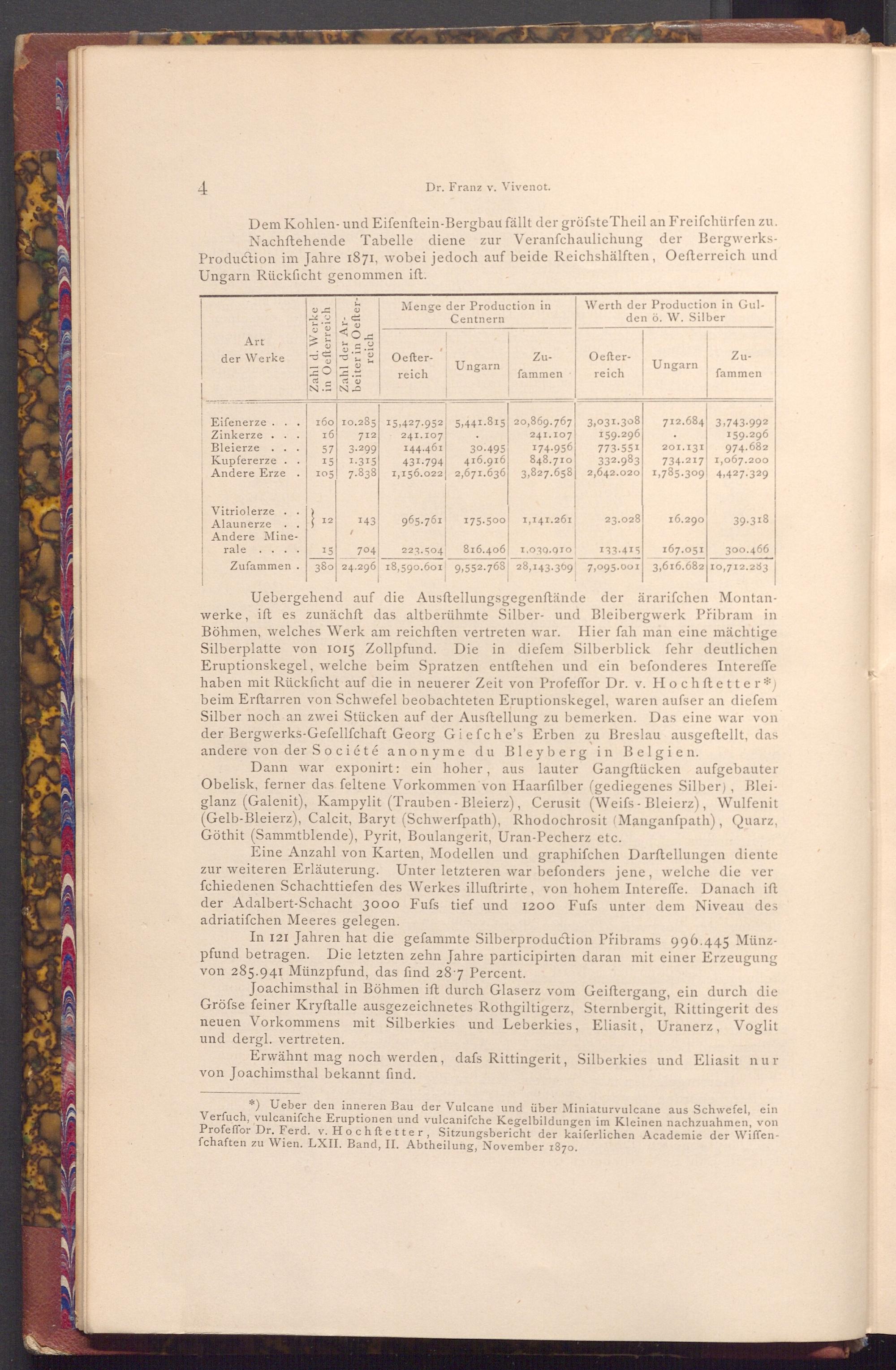 Uebergehend auf die Ausftellungsgegenstände der ärarifchen Montanwerke, ift es zunächft das altberühmte Silber- und Bleibergwerk Přibram in Böhmen, welches Werk am reichften vertreten war. Hier fah man eine mächtige Silberplatte von 1015 Zollpfund. Die in diefem Silberblick fehr deutlichen. Eruptionskegel, welche beim Spratzen entſtehen und ein befonderes Intereffe haben mit Rückficht auf die in neuerer Zeit von Profeffor Dr. v. Hochftetter*) beim Erftarren von Schwefel beobachteten Eruptionskegel, waren aufser an diefem Silber noch an zwei Stücken auf der Ausftellung zu bemerken. Das eine war von der Bergwerks- Gefellſchaft Georg Giefche's Erben zu Breslau ausgeftellt, das andere von der Société anonyme du Bleyberg in Belgien.