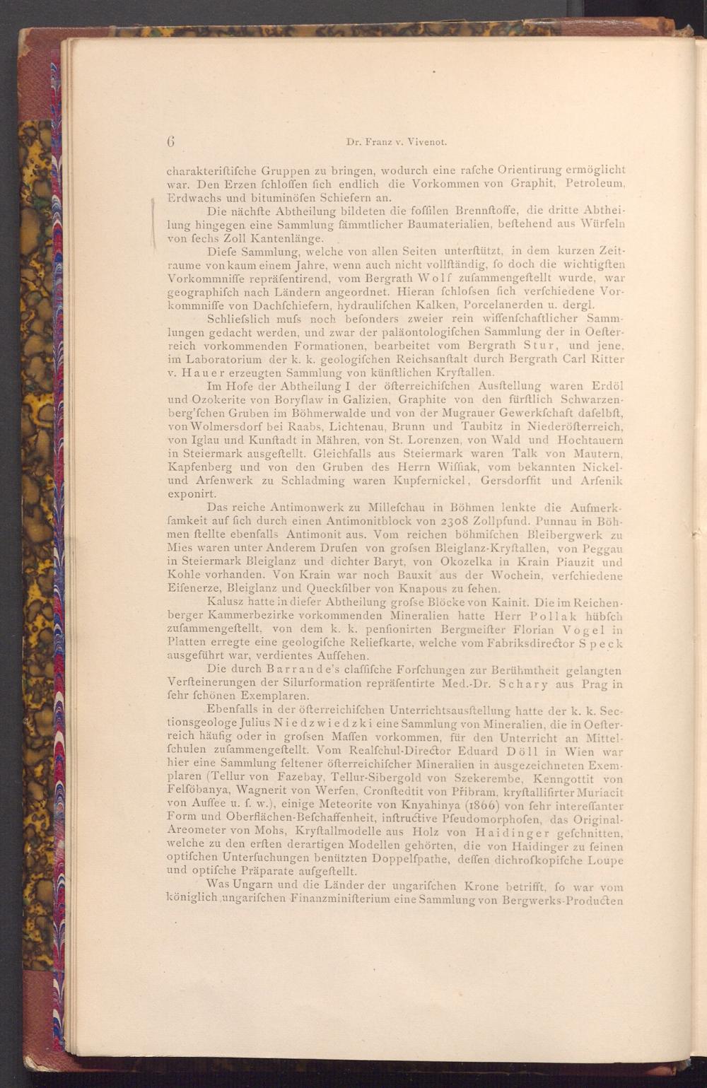 Schliefslich mufs noch befonders zweier rein wiffenfchaftlicher Sammlungen gedacht werden, und zwar der paläontologifchen Sammlung der in Oefterreich vorkommenden Formationen, bearbeitet vom Bergrath Stur, und jene, im Laboratorium der k. k. geologifchen Reichsanftalt durch Bergrath Carl Ritter v. Hauer erzeugten Sammlung von künftlichen Kryftallen.