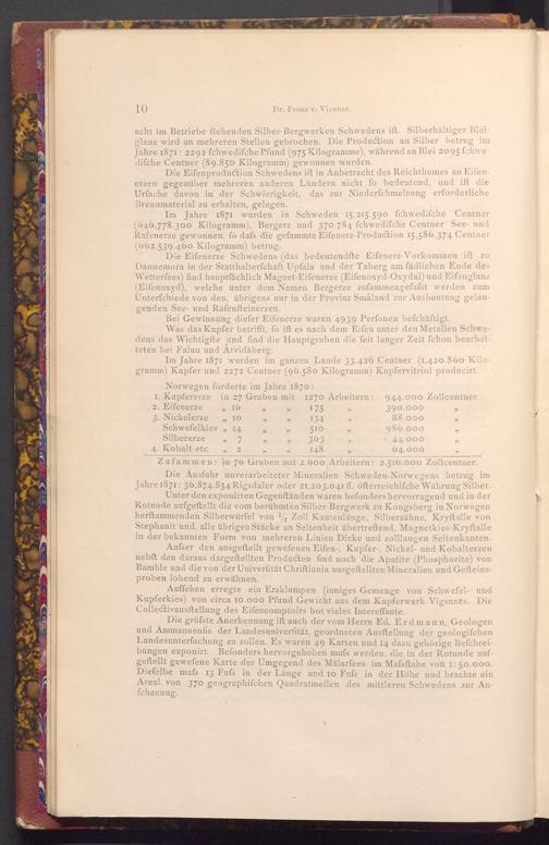 4. Kobalt etc. Zufammen: in 70 Gruben mit 2.600 Arbeitern: 2,516.000 Zollcentner. Die Ausfuhr unverarbeiteter Mineralien Schweden- Norwegens betrug im Jahre 1871: 36,874.854 Rigsdaler oder 21,203.041 fl. öfterreichifche Währung Silber. Unter den exponirten Gegenftänden waren befonders hervorragend und in der Rotunde aufgeftellt die vom berühmten Silber- Bergwerk zu Kongsberg in Norwegen herftammenden Silberwürfel von ½ Zoll Kantenlänge, Silberzähne, Kryftalle von Stephanit und, alle übrigen Stücke an Seltenheit übertreffend, Magnetkies- Kryftalle in der bekannten Form von mehreren Linien Dicke und zolllangen Seitenkanten. Aufser den ausgeftellt gewefenen Eifen-, Kupfer-, Nickel- und Kobalterzen nebft den daraus dargestellten Producten find noch die Apatite( Phosphorite) von Bamble und die von der Univerfität Chriftiania ausgeftellten Mineralien und Gefteinsproben lobend zu erwähnen.