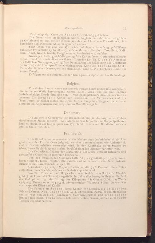 Von den franzöfifchen Colonien hatte Algier goldhältigen Quarz, Goldkörner, Silber-, Eifen-, Kupfer-, Blei-, Zink- und Antimonerze, dann Salz, Arfenik, Schwefel und Porcellanerde ausgeftellt.