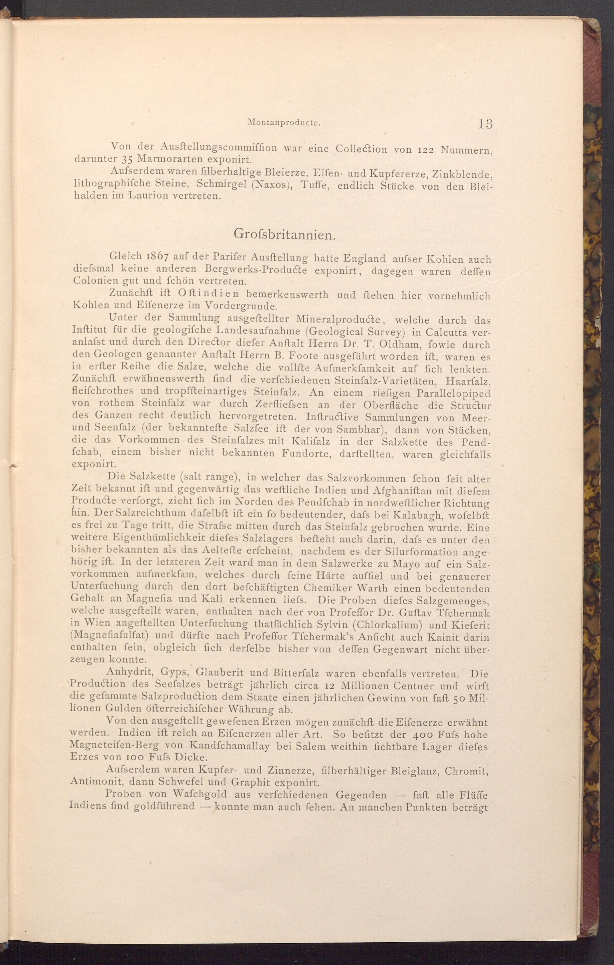 Die Salzkette( salt range), in welcher das Salzvorkommen fchon feit alter Zeit bekannt ift und gegenwärtig das weftliche Indien und Afghaniſtan mit diefem Producte verforgt, zieht fich im Norden des Pendfchab in nordweftlicher Richtung hin. Der Salzreichthum dafelbft ift ein fo bedeutender, dafs bei Kalabagh, wofelbft es frei zu Tage tritt, die Strafse mitten durch das Steinfalz gebrochen wurde. Eine weitere Eigenthümlichkeit diefes Salzlagers befteht auch darin, dafs es unter den bisher bekannten als das Aeltefte erfcheint, nachdem es der Silurformation angehörig ift. In der letzteren Zeit ward man in dem Salzwerke zu Mayo auf ein Salzvorkommen aufmerkfam, welches durch feine Härte auffiel und bei genauerer Unterfuchung durch den dort befchäftigten Chemiker Warth einen bedeutenden Gehalt an Magnefia und Kali erkennen liefs. Die Proben diefes Salzgemenges, welche ausgeftellt waren, enthalten nach der von Profeffor Dr. Guftav Tfchermak in Wien angeftellten Unterfuchung thatfächlich Sylvin( Chlorkalium) und Kieferit ( Magnefiafulfat) und dürfte nach Profeffor Tfchermak's Anficht auch Kainit darin enthalten fein, obgleich fich derfelbe bisher von deffen Gegenwart nicht überzeugen konnte.