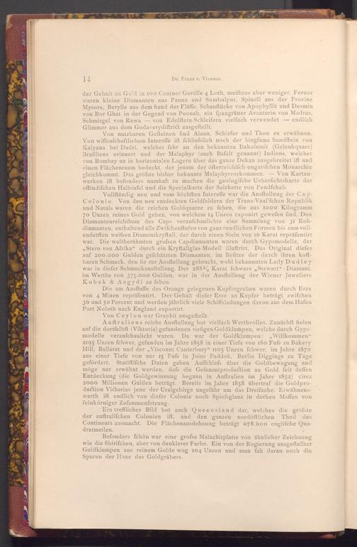 Befonders fchön war eine grofse Malachitplatte von ähnlicher Zeichnung wie die fibirifchen, aber von dunklerer Farbe. Ein von der Regierung ausgeftellter Goldklumpen aus reinem Golde wog 104 Unzen und man fah daran noch die Spuren der Haue des Goldgräbers.