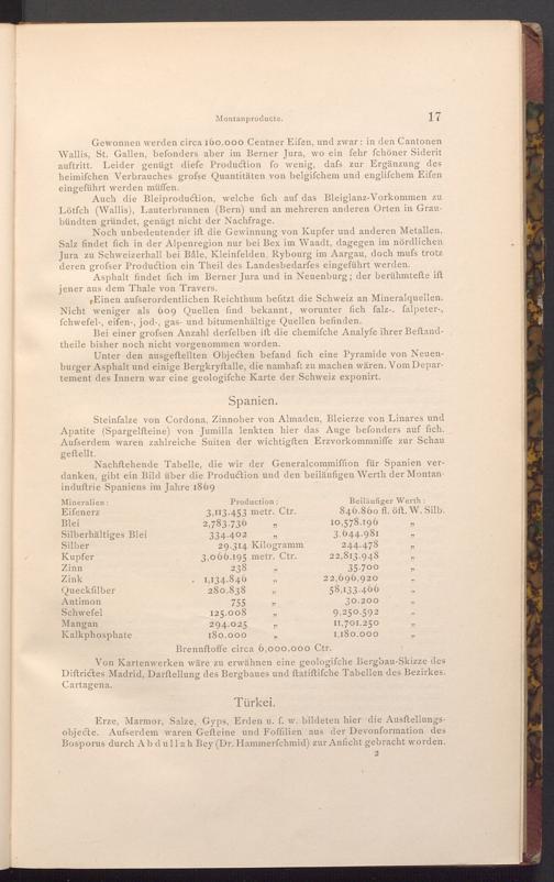 Steinfalze von Cordona, Zinnober von Almaden, Bleierze von Linares und Apatite( Spargelfteine) von Jumilla lenkten hier das Auge befonders auf fich. Aufserdem waren zahlreiche Suiten der wichtigften Erzvorkommniffe zur Schau geftellt.