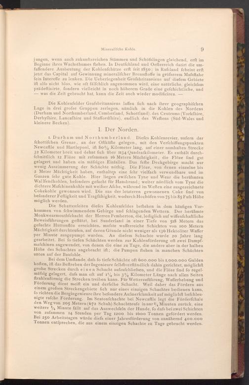 1. Durham und Northumberland. Diefes Kohlenrevier, unfern der fchottifchen Grenze, an der Oftküfte gelegen, mit den Verfchiffungspunkten Newcaftle und Hartlepool, ift 80% Kilometer lang, auf einer namhaften Strecke 32 Kilometer breit und dehnt fich über 1134 Quadratkilometer. Es enthält durchfchnittlich 12 Flöze mit zufammen 16 Metern Mächtigkeit, die Flöze find gut gelagert und haben ein mäfsiges Einfallen. Das fefte Deckgebirge macht nur wenig Auszimmerung der Schächte nöthig. Die Flöze, von denen einzelne bis 2 Meter Mächtigkeit haben, enthalten eine fehr vielfach verwendbare und im Ganzen fehr gute Kohle. Hier liegen zwifchen Tyne und Wear die berühmten Wallfend kohlen, befonders gefucht für Hausbrand; weiter nördlich vom Tyne die dichtere Mafchinenkohle mit weifser Afche, während im Weften eine ausgezeichnete Cokekohle gewonnen wird. Die aus der letzteren gewonnenen Coke find von befonderer Feftigkeit und Tragfähigkeit, wodurch Hochöfen von 75 bis 85 Fufs Höhe möglich werden.