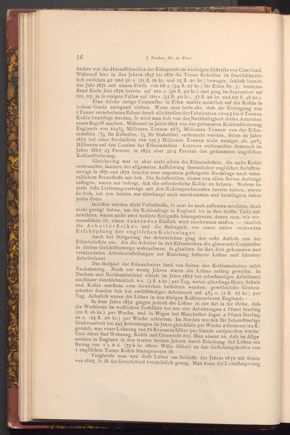 Das Beiſpiel der Eifenarbeiter fand von Seiten der Kohlenarbeiter rafch Nachahmung. Noch vor wenig Jahren waren die Löhne mäfsig gewefen. In Durham und Northumberland erhielt im Jahre 1867 bei zehnftündiger Arbeitszeit ein Häuer durchſchnittlich 6 s.( 3 fl. 2 kr.) per Tag, wobei allerdings Haus, Schule und Kohle meiftens vom Gewerken beftritten wurden; gewöhnliche Grubenarbeiter ftanden fich bei zwölfftündiger Arbeitszeit auf 4 s.( 2 fl. 27 kr.) per Tag. Aehnlich waren die Löhne in den übrigen Kohlenrevieren Englands.