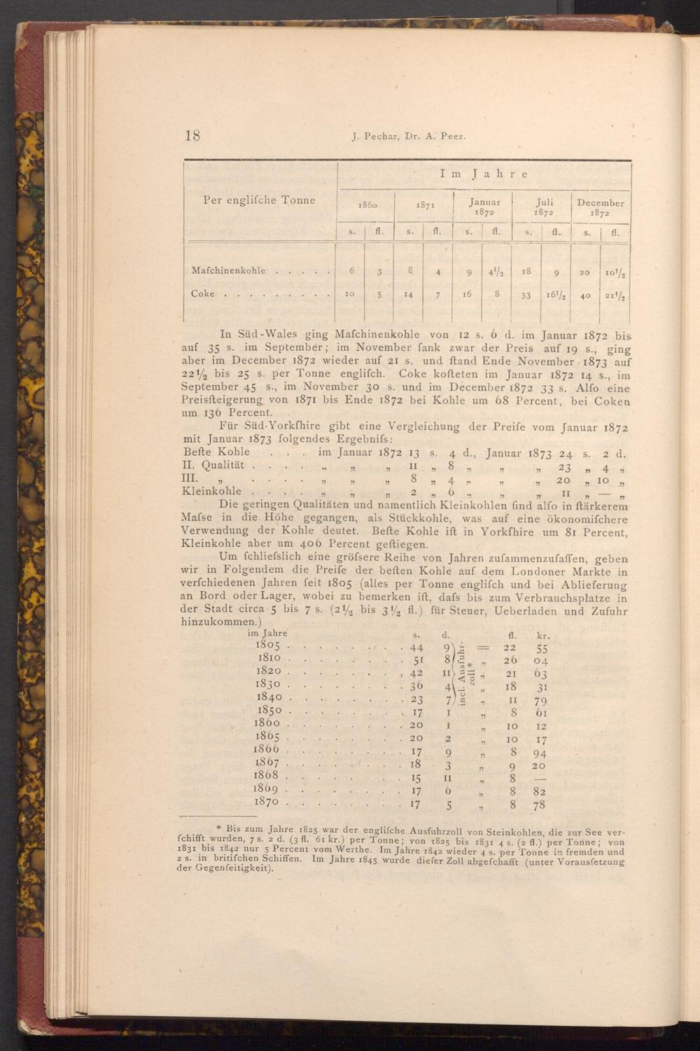 Um fchliefslich eine gröfsere Reihe von Jahren zufammenzufaffen, geben wir in Folgendem die Preife der beften Kohle auf dem Londoner Markte in verfchiedenen Jahren feit 1805( alles per Tonne englifch und bei Ablieferung an Bord oder Lager, wobei zu bemerken ift, dafs bis zum Verbrauchsplatze in der Stadt circa 5 bis 7 s.( 212 bis 32 fl.) für Steuer, Ueberladen und Zufuhr hinzukommen.)