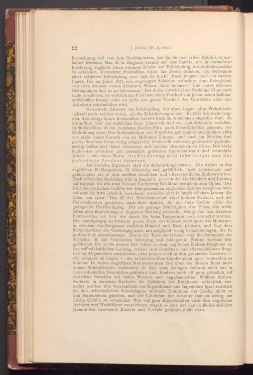 Auf dasfelbe Ergebnifs läuft die Arbeiterfrage hinaus. Die Arbeit in den englifchen Kohlengruben ift fchwierig und gefährlich, weit fchwieriger und gefährlicher als in den meiften deutfchen und öfterreichifchen Kohlenwerken. Nach officiellen Berichten fällt in England, je nach der Oertlichkeit und Leitung auf 60.000 bis 180.000 Tonnen Förderung Ein Menfchenleben zum Opfer. Die Zahl der tödtlichen Unfälle bei dem gefammten englifchen Kohlen- Bergbaue wird auf 900 bis 1100 jährlich berechnet, erreichte aber in unglücklichen Jahren die Ziffer von 1400! Das ift der Menfchenverluft einer kleinen Schlacht und die Ueberlebenden geniefsen, nach ihrer Anficht, für die ftete Gefahr nicht die genügende Entfchädigung. Die oft geringe Mächtigkeit der Flöze, die nicht felten eine Bearbeitung in liegender Stellung erheifcht, bringt für den Arbeiter Befchwerden mit fich, die durch die hohe Temperatur noch vermehrt werden. Die durchgängig beftehende grofse Tiefe der Gruben verlängert die Momente, in welchen der Bergmann zwifchen Himmel und Erde fchwebt, und legt dem Kohlenbefitzer die Verfuchung nahe, mit möglichst wenig Schachtanlagen, die fo koftbar find, auszukommen. Durch die Tiefe der Gruben und die Seltenheit der Schächte ift die Ventilation fchwierig und fchlagende Wetter werden fehr gefährlich. Bis in die neuere Zeit fehlte es dem englifchen Kohlen- Bergbaue an der wiffenfchaftlichen Leitung, welche den deutfchen und öfterreichifchen Bergbau im Allgemeinen auszeichnet, ohne jedoch auch in den genannten Ländern wir erinnern an Lugau- die erfchütterndften Cataftrophen ganz vermeiden zu können. In vielen englifchen Kohlenrevieren find über die älteren Baue nicht einmal Grubenkarten vorhanden, fo dafs neue Anlagen dadurch nicht nur in ihrer rationellen Dispofition gehindert find, fondern auch oft ganz plötzlich auf verlaffene Strecken mit böfen Wettern und angefammelten Wäffern ftofsen, wodurch in manchen Revieren die Gefahren des Bergbaues wefentlich vermehrt werden. Die Gewinnfucht der Eigenthümer und Ingenieure fpart zuweilen an den erforderlichen Stützanlagen, wefshalb Einbrüche der Decke nicht zu den Seltenheiten gehören, und der Leichtfinn der Arbeiter thut zu wenig, um folche Unfälle zu vermeiden. Wie viel gute Eigenfchaften auch den englifchen Arbeiter und Werkführer auszeichnen mögen- eine auf naturwiffenfchaftlichen Kenntniffen beruhende Einficht und Vorficht gehören nicht dazu.